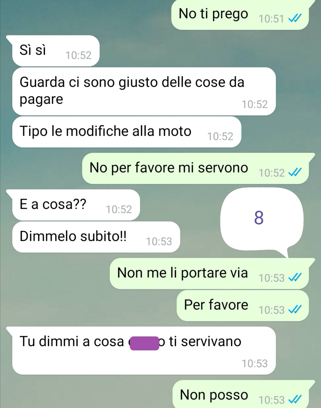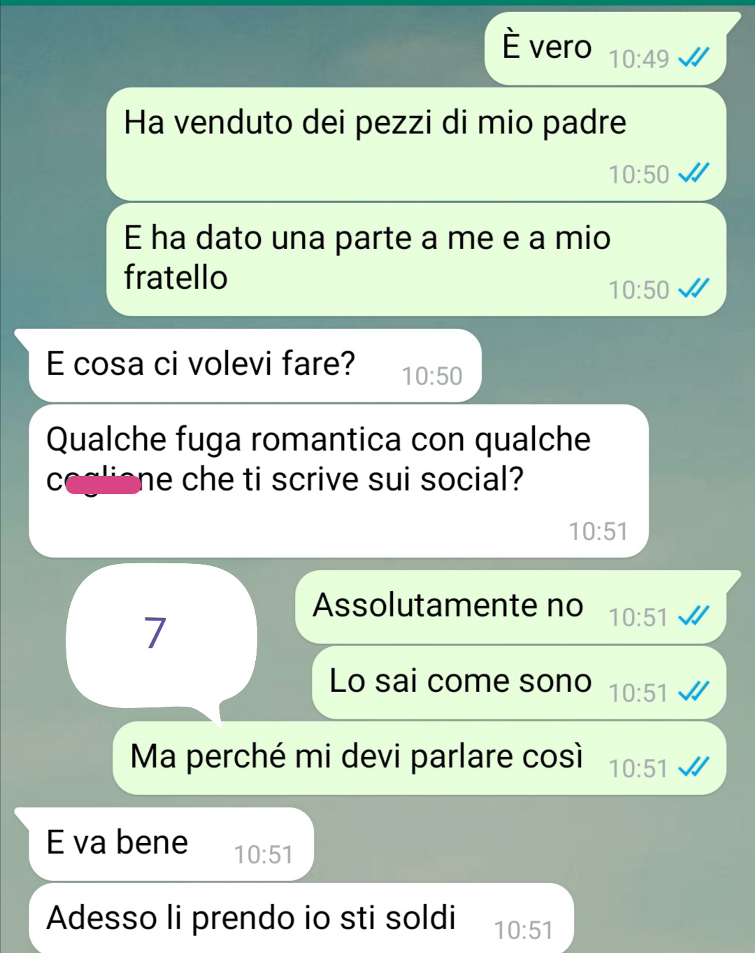 La nostra fan, Stefania, ha deciso di condividere una conversazione che ha segnato un momento decisivo nella sua vita. Una linea di confine che ha diviso ciò che era da ciò che sarebbe diventato. Tutto ha avuto inizio quattro anni fa, quando conosce un ragazzo che le appare subito diverso da tutti gli altri: attento, premuroso, sempre pronto a farla sentire importante. Un rapporto che cresce in fretta, tanto che, nel giro di pochi mesi, iniziano a convivere nella casa di lui.