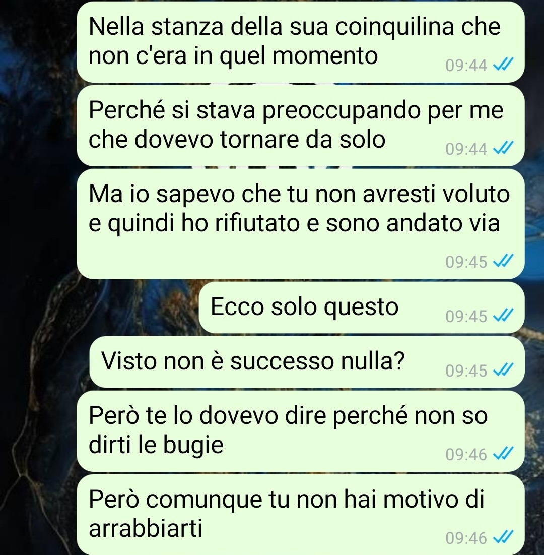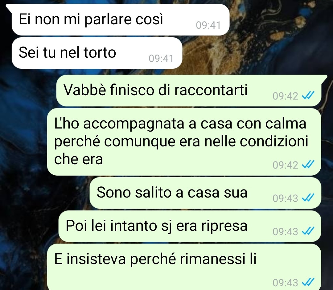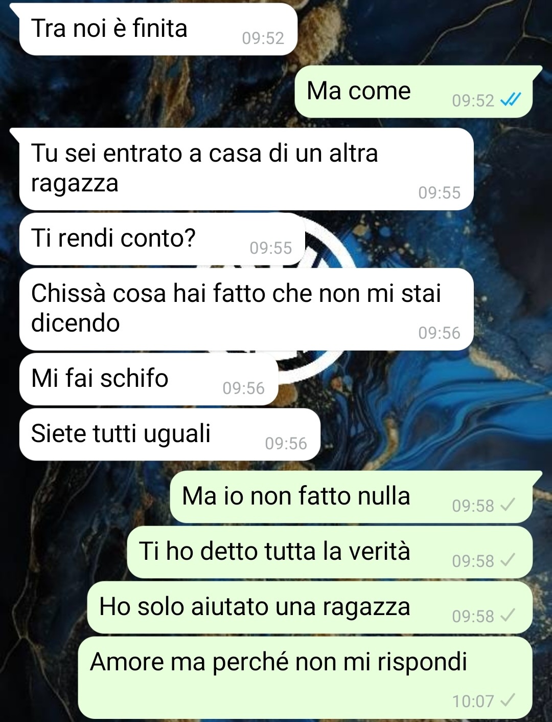 Nel messaggio, il nostro fan esprime dispiacere e incomprensione per la chiusura totale della compagna, convinto che la gelosia e la paranoia abbiano oscurato ogni capacità di ragionare. A suo dire, il gesto che per lui rappresentava semplice umanità è stato interpretato come un tradimento di fiducia. Conclude il suo racconto ribadendo di non sentirsi colpevole e di trovare assurdo che un atto di aiuto possa essere scambiato per mancanza di rispetto in una coppia.