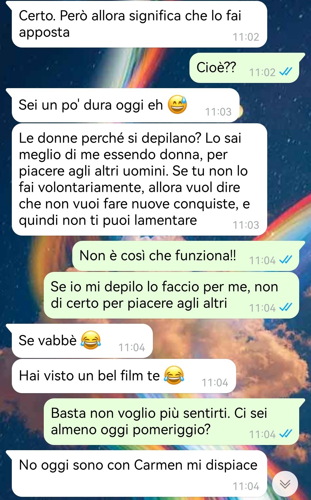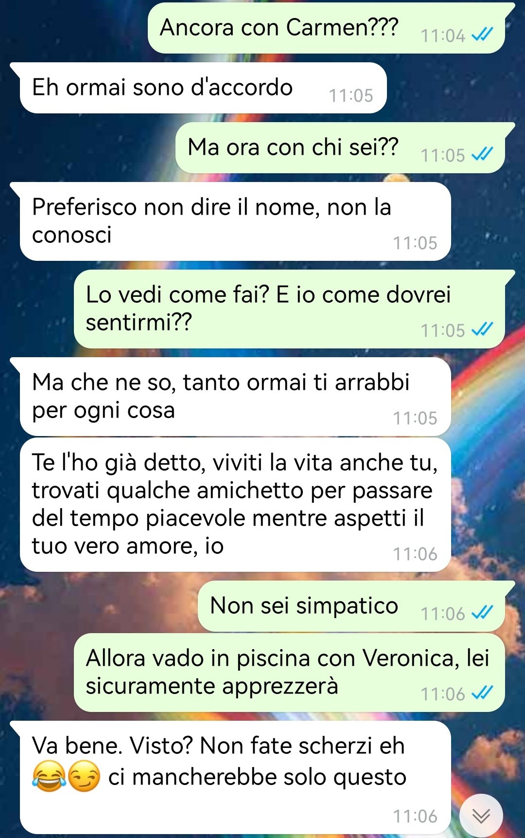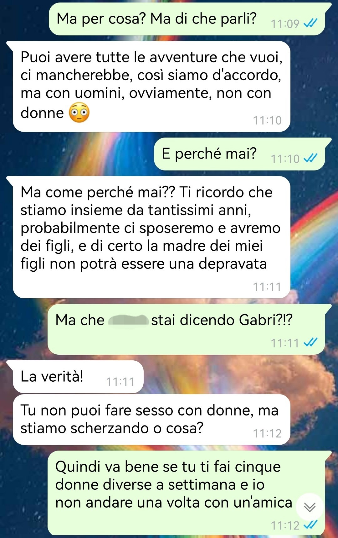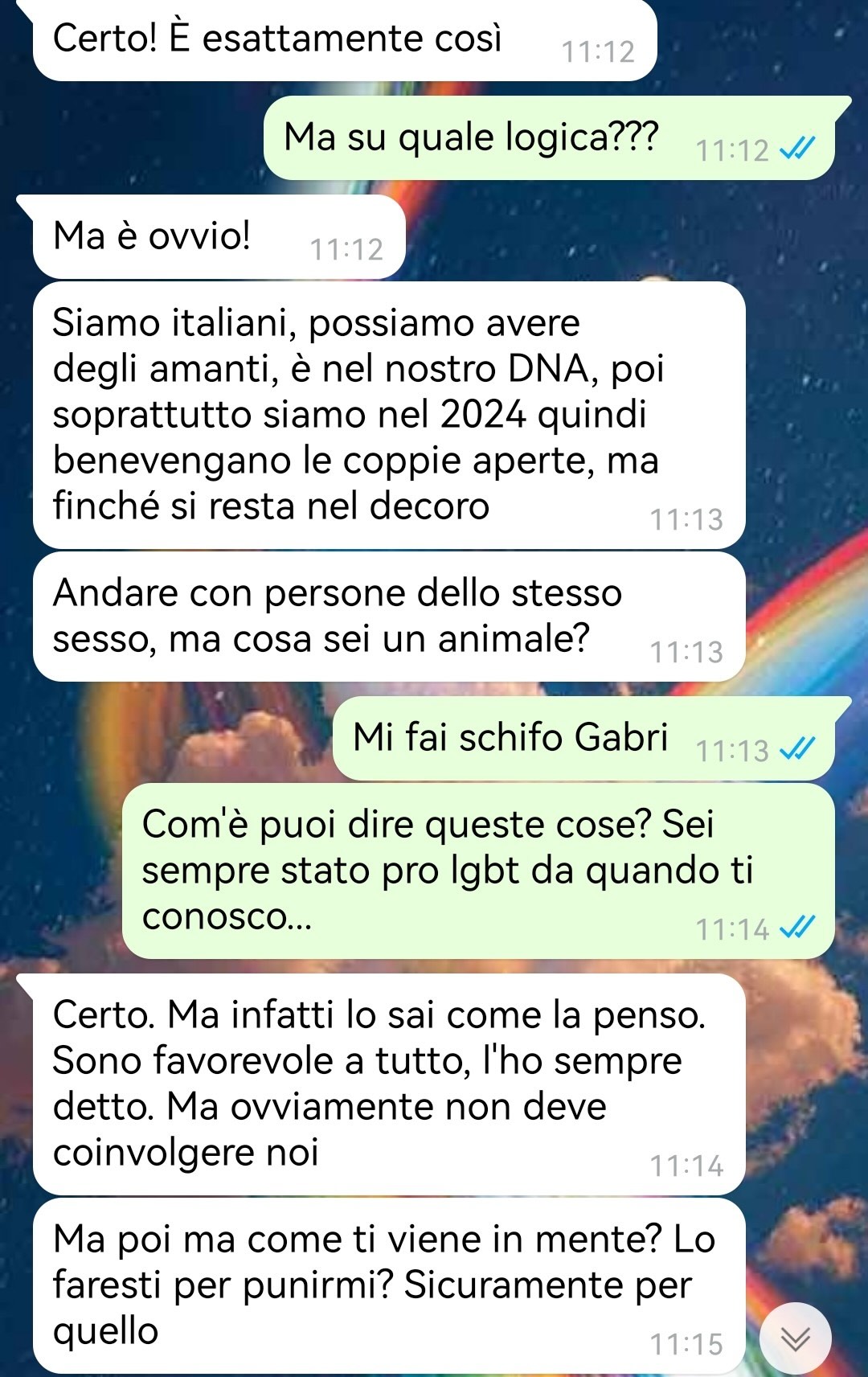 Stanno insieme per dieci anni in una relazione solida, ma dopo quel traguardo qualcosa inizia a cambiare. Il cambiamento parte soprattutto da lui, Gabriele, che comincia a parlare di amore, di libertà, e di nuovi modi di vivere il legame. La sua proposta è chiara: trasformare la loro relazione in una coppia aperta. Una scelta che, secondo quanto racconta la nostra fan, le è stata proposta in un momento in cui non si sentiva nemmeno in grado di opporsi realmente.