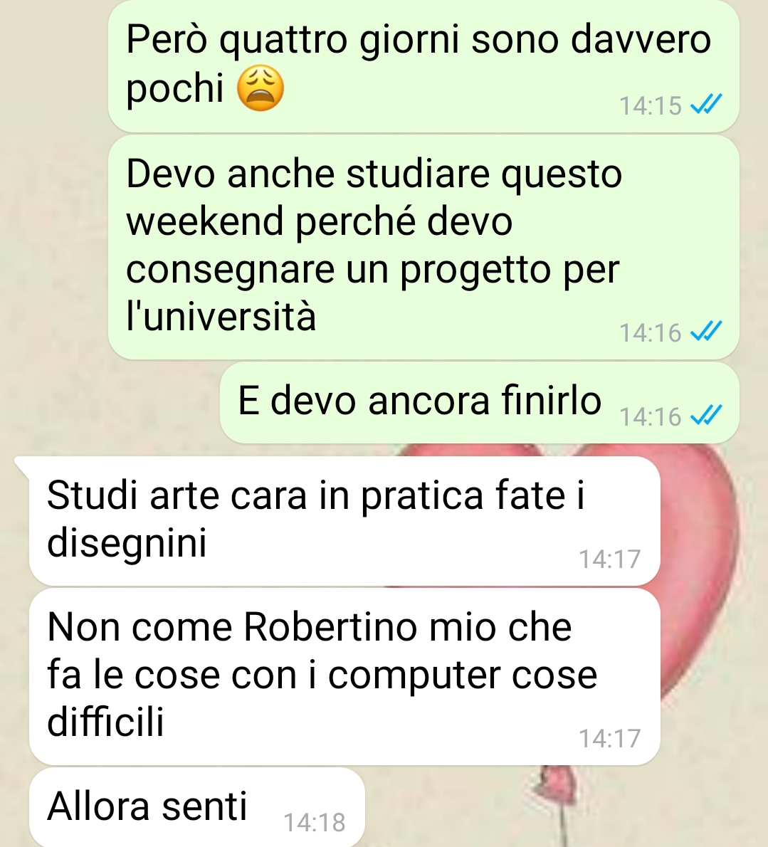 La nostra fan Ginevra, 25 anni, si è rivolta a Commenti Memorabili per condividere una preoccupazione che riguarda il suo percorso professionale e i sogni che coltiva fin dall’infanzia. La giovane racconta di aver sempre desiderato diventare una pittrice, una passione che l’ha accompagnata durante tutta la sua crescita e che continua a nutrire con grande dedizione. Per seguire questa vocazione artistica, l’amica ha scelto di frequentare il liceo artistico e successivamente l’università, sempre rimanendo nell’ambito delle discipline artistiche.