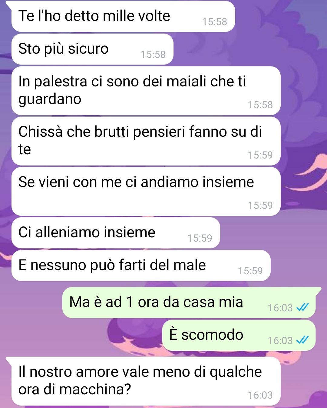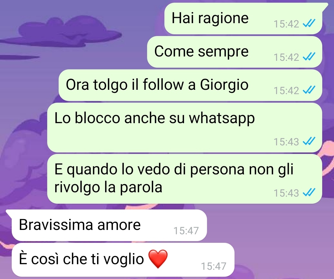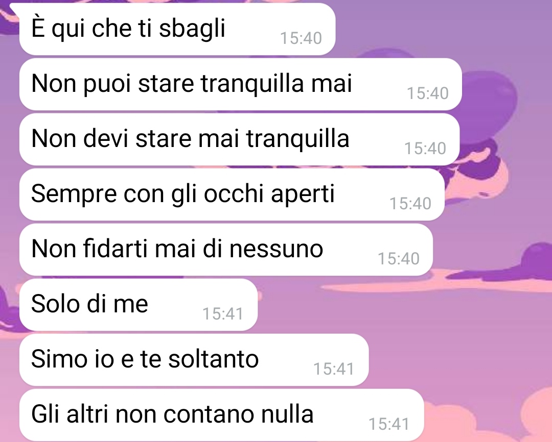 L’amica spiega di aver deciso di condividere parte di quei messaggi perché li considera particolarmente esplicativi del tipo di rapporto che la coppia sta vivendo, che descrive come problematico. Sottolinea inoltre di non sapere come comportarsi né come intervenire, motivo per cui cerca un confronto esterno.