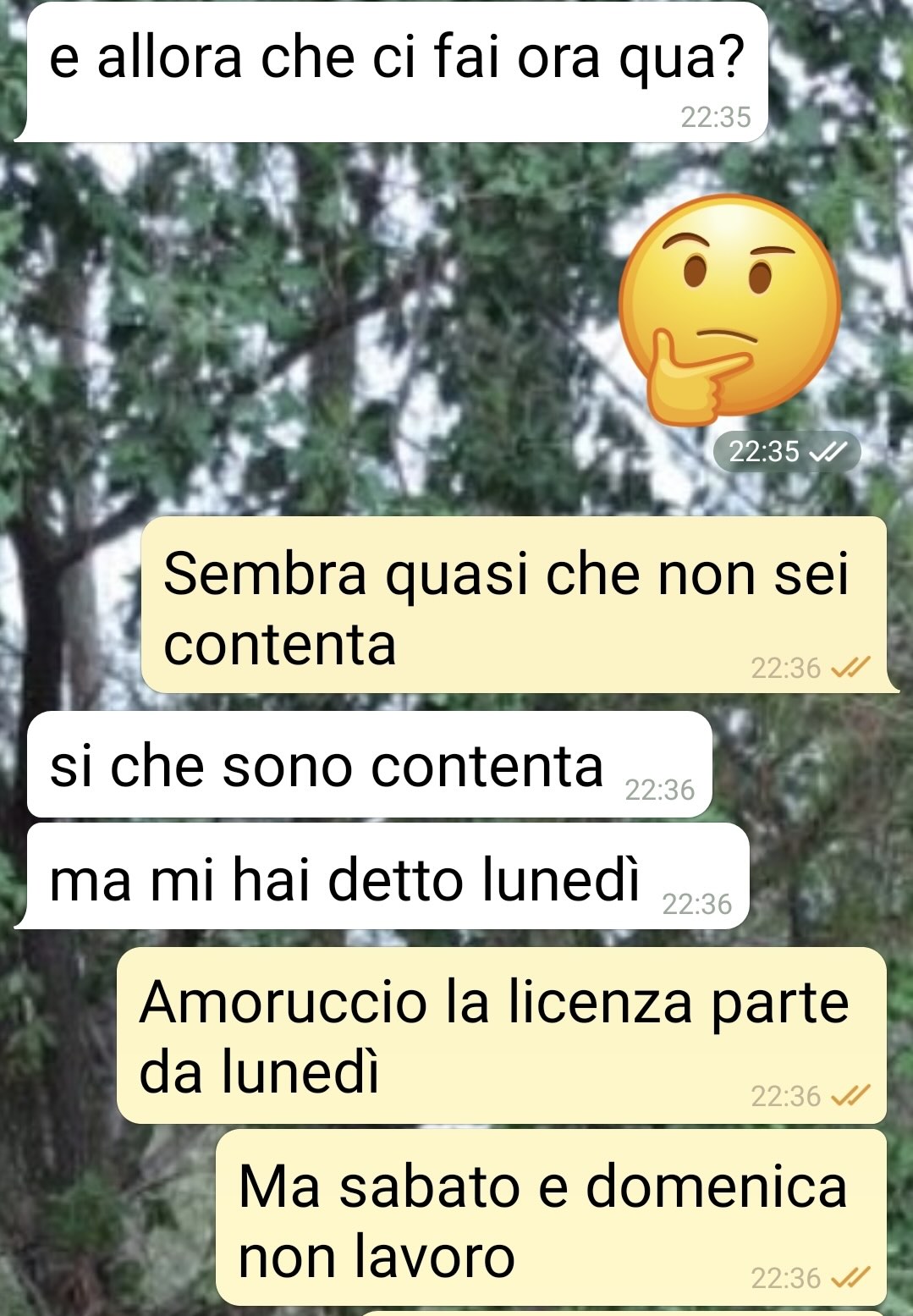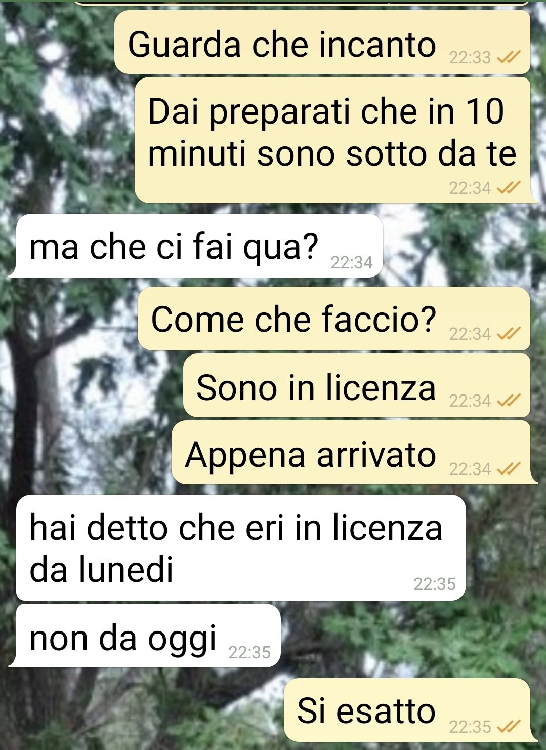 La mia fidanzata non ha capito come funziona la mia licenza, e questa cosa le è costata cara. Ci ha rimesso il fidanzato e la dignità. Mi chiamo Mauro e sono un militare di professione. Da un anno faccio servizio a 800 km dalla mia ciBadina, dove risiedo e dove sta la mia fidanzata Manuela. SDamo insieme da 3 anni. 3 anni che fino a ieri sera giudicavo semplicemente perfeF. Amore, armonia, complicità e liDgi col contagocce e mai per moDvi seri. Ma oggi sono qui a farvi leggere come forse tuBo quanto sia stato solo un’illusione. Altro che le sorprese ravvivano l’amore… lo distruggono. O meglio D fanno scoprire che l’amore è finito chissà da quanto, dalla parte opposta. E a te rimangono solo le corna. E dire che non era affaBo una sorpresa. Sono solo rientrato quando previsto, quando ampiamente prevedibile. L’unica cosa (meno male a questo punto…) è che ho dato per scontato che Manu sapesse come funziona la mia licenza. Ma non sapeva… e stava chissà dove… chissà con chi…e col COVID!