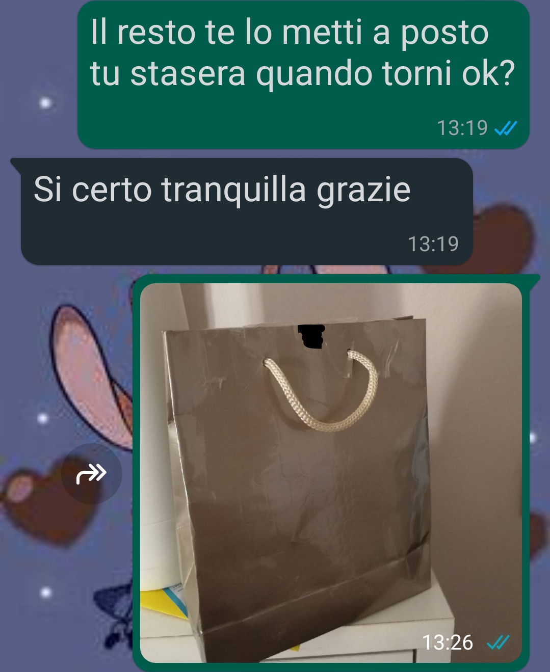 Bando alle ciance, ciancio alle bande, tutto è successo quando un giorno sono andata a portare a Cristian la spesa in pausa pranzo, perché lui non riusciva ad andare e gli ho fatto questo favore. Mentre ero a casa sua, ho notato che c’era un pacchettino regalo sulla scarpiera in ingresso, gli ho chiesto e mi ha detto che era per me. Non era da parte sua, ma da parte della sua ex Beatrice. Così ho scritto a lei ed è cominciato il degenerio.