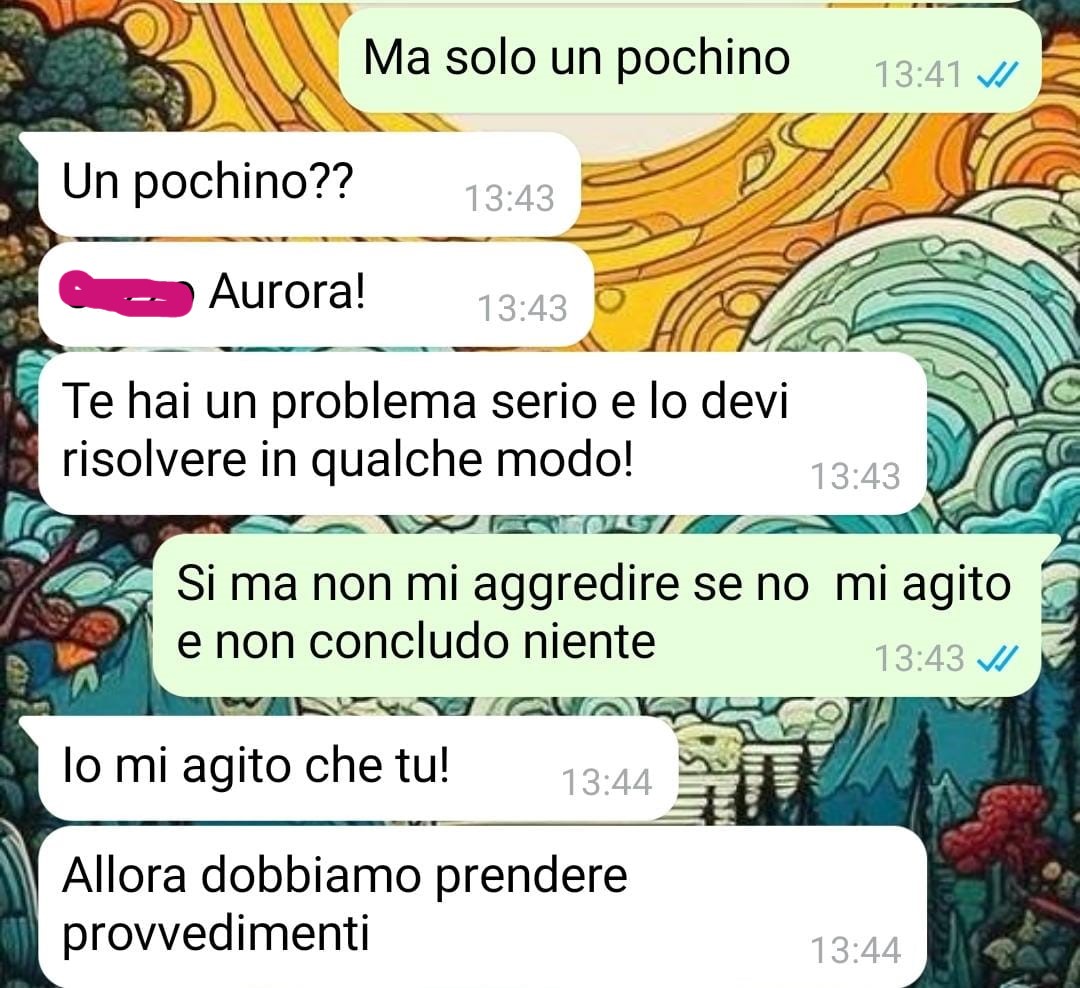 Nonostante questo, il suo ragazzo sembra particolarmente arrabbiato e pretende che prenda provvedimenti seri, cosa che a lei sembra esagerata. Aurora ammette di poter aver fatto qualche errore, ma non ritiene che la situazione sia così grave come lui sostiene. Per questo ha deciso di condividere la loro conversazione, per capire se davvero sta sbagliando così tanto o se il suo compagno sta solo esagerando.