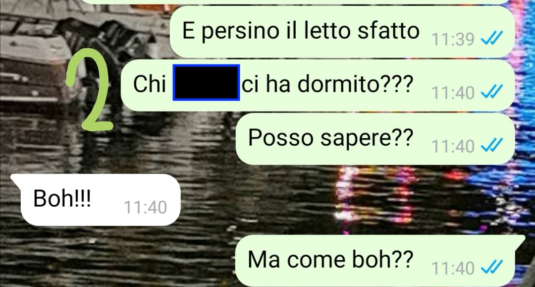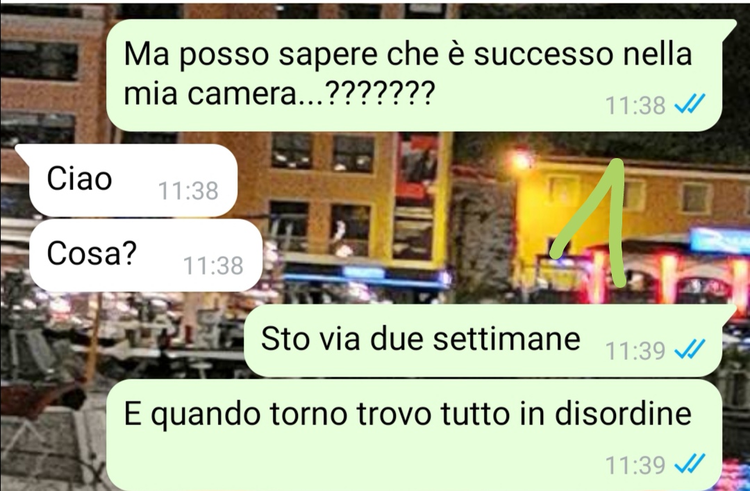 Mi chiamo Luisa, sono originaria di Terni ma mi sono trasferita anni fa a Milano per studiare e ci sono rimasta per lavoro. Ultimamente a causa di impegni familiari mi capita spesso di tornare a casa e grazie alla possibilità dello smart working Lo posso fare più di frequente. Non posso lasciare comunque la mia abitazione a Milano, che condivido con altri due ragazzi (un ragazzo e una ragazza) per poter pagare di meno, come fanno un po’ tutti. Ultimamente però sta succedendo qualcosa di strano. Ogni volta che torno ho come la sensazione che la mia richiesta di non entrare in camera mia per nessuna ragione al mondo venga ignorata. All’inizio era solo una sensazione e capisco di poter risultare un po’ pesante, ma io credo che soprattutto quando si co-abita da adulti almeno la propria stanza debba rimanere sacra! Ma quando mi sono assentata l’ultima volta e sono tornata… Non immaginerete cosa ho letteralmente trovato! Ovviamente chiamo subito la mia coinquilina per avere spiegazioni… Ma lei non risponde, provo allora con l’altro al quale poi mando un messaggio e proprio mentre sto scrivendo… Ecco cosa vedo in casa nostra!