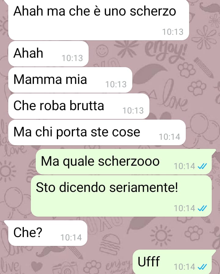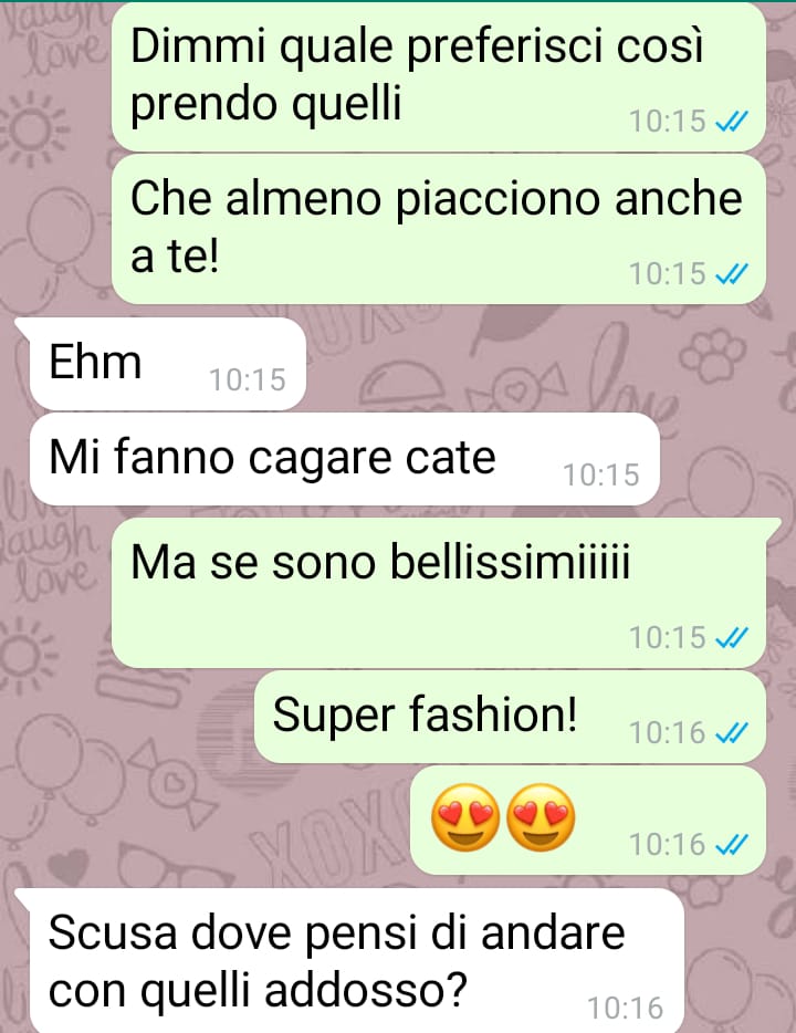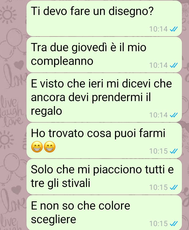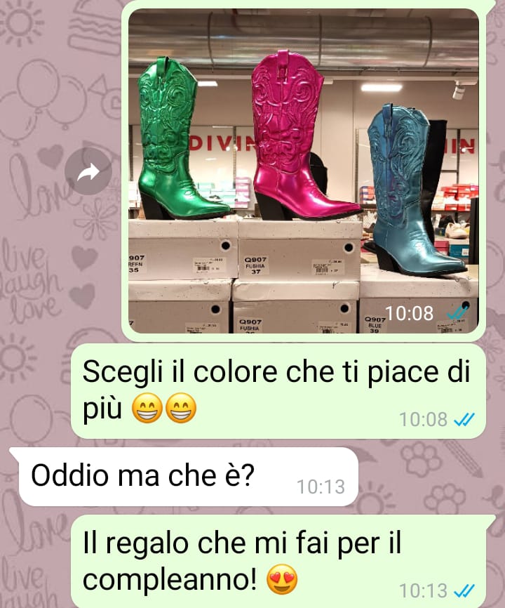 mi chiamo Caterina e sono un’appassionata di moda. Purtroppo per vari motivi non ho potuto prendere un percorso scolastico che mi consentisse di intraprendere una carriera lavorativa nel mondo della moda, perciò per me rimane soltanto una passione ma che sento molto forte e che cerco di esprimere in tutti i modi. Dato che il mio compleanno si avvicina, ho inviato una foto di alcuni stivali spettacolari che avrei voluto come regalo da parte del mio ragazzo. Onestamente penso che a tutte le ragazze piacerebbe poter indossare colori sgargianti e unici, soprattutto in estate, ecco perché appena li ho visti me ne sono innamorata. Ovviamente mi sono ritrovata davanti a una decisione importante, quella della scelta del colore, perciò dato che il regalo me lo avrebbe fatto il mio ragazzo, ho deciso di far scegliere a lui! La sua reazione al riguardo è a dir poco vergognosa e vorrei far vedere a tutti come ai nostri giorni noi donne siamo ancora obbligate a scegliere i nostri capi d’abbigliamento in base a quello che pensa il proprio compagno!
