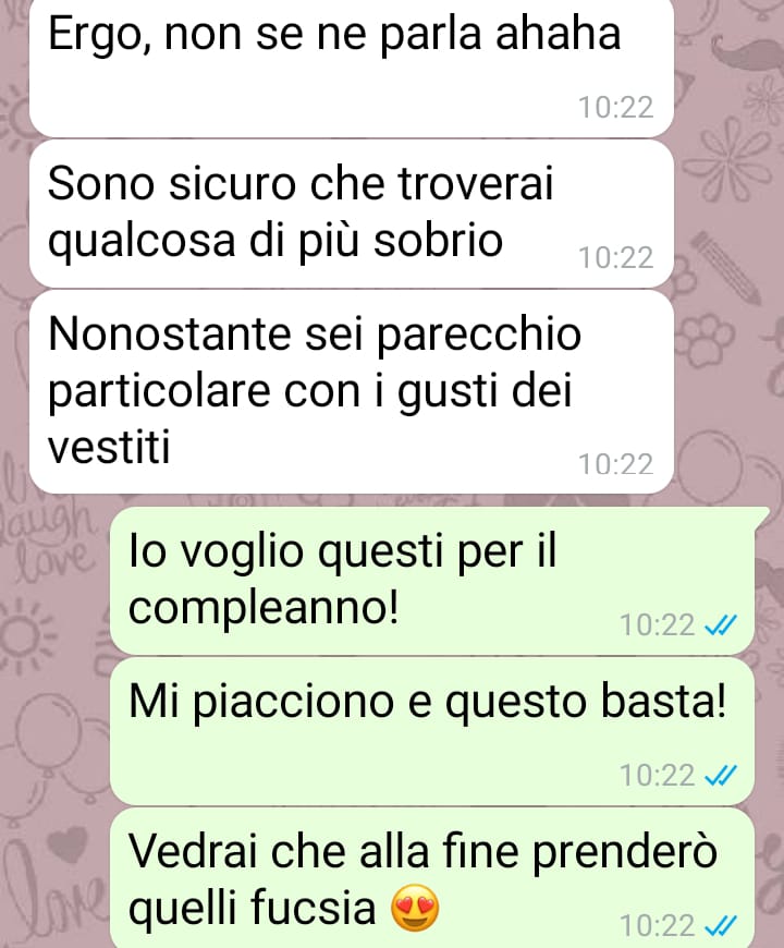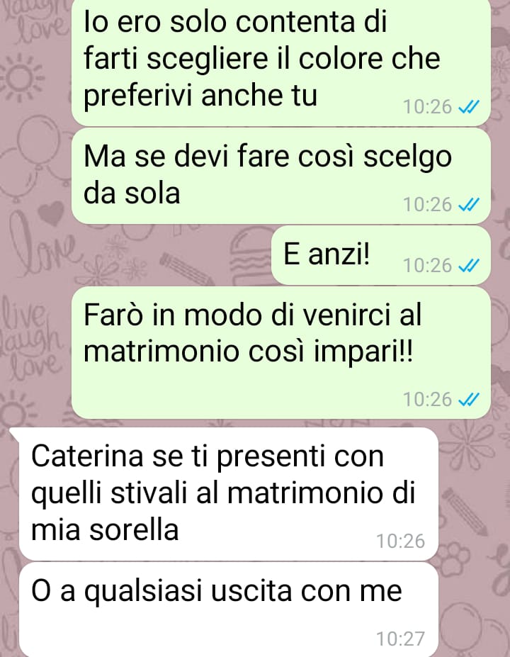 Con l’avvicinarsi del suo compleanno, Caterina ha individuato un paio di stivali molto particolari che ha subito amato a prima vista, soprattutto per i loro colori vivaci e originali, ideali – secondo lei – per l’estate. Ha quindi deciso di inviare la foto del modello al proprio ragazzo, lasciando a lui la possibilità di scegliere il colore da regalarle, un gesto che pensava potesse coinvolgerlo e renderlo partecipe di un momento speciale.