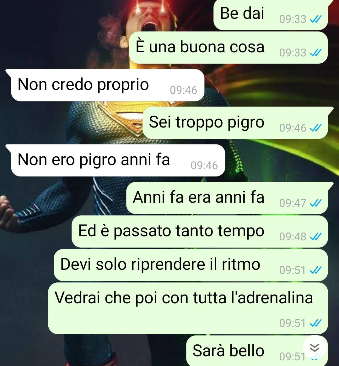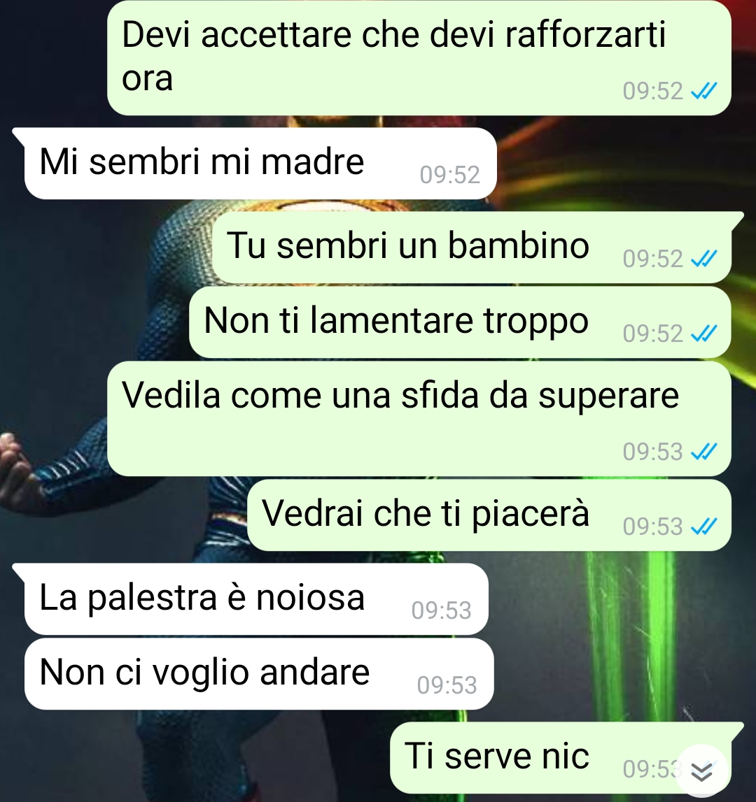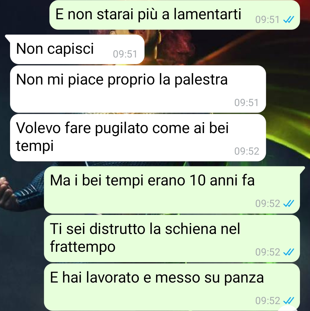 Sono Cristina e penso di aver stabilito un record non indifferente nel mandarvi questa storia. Ovvero che alla fine della fiera io e il mio ragazzo non ci siamo lasciati (non ancora, ma se continua a comportarsi così potrebbero esserci i presupposti). Ho notato che tantissime persone che mandano chat qui poi si lasciano, ma non è il mio caso. Lui mi ha solo fatta arrabbiare veramente tanto perché pensa di fare il grande adulto, e invece è un mammone bambinone e io vorrei che crescesse. Io ho 32 anni, ho un lavoro, vivo sola e sto con lui da 10 anni, che sono veramente tanti se ci si pensa un attimo. Lui si chiama Nicolò, di anni ne ha 33 e sono fiera di ciò che ha ottenuto nel corso del tempo, ma potrebbe tutto vanificarsi per una sua imposizione davvero di poco conto. Si è laureato dopo tanti sacrifici, lavora da tanto tempo e pur essendo stato uno sportivo un tempo, praticamente nei primi anni che stavo con lui, poi ha smesso e non ha più ripreso, ora soffre di dolori di schiena e altre cose e per questo motivo il medico gli ha detto di iniziare a fare attività fisica. Ma non quella che vorrebbe lui, ma una molto specifica che lo ha portato a fare qualcosa di molto stupido.