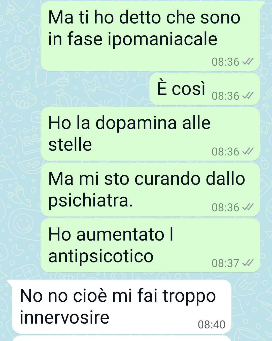 La nostra amica chiarisce che questo disturbo non ha nulla a che vedere con l’“avere due facce”. Non si tratta di cambiamenti voluti o di un modo di essere costruito, ma di alterazioni dell’umore che si manifestano in fasi ben precise. Racconta che ci sono periodi in cui si sente estremamente attiva ed energica: dorme poco, ha una sensazione di forza continua, si sente invincibile e piena di idee. In quei momenti, la mente corre veloce e tutto sembra possibile.