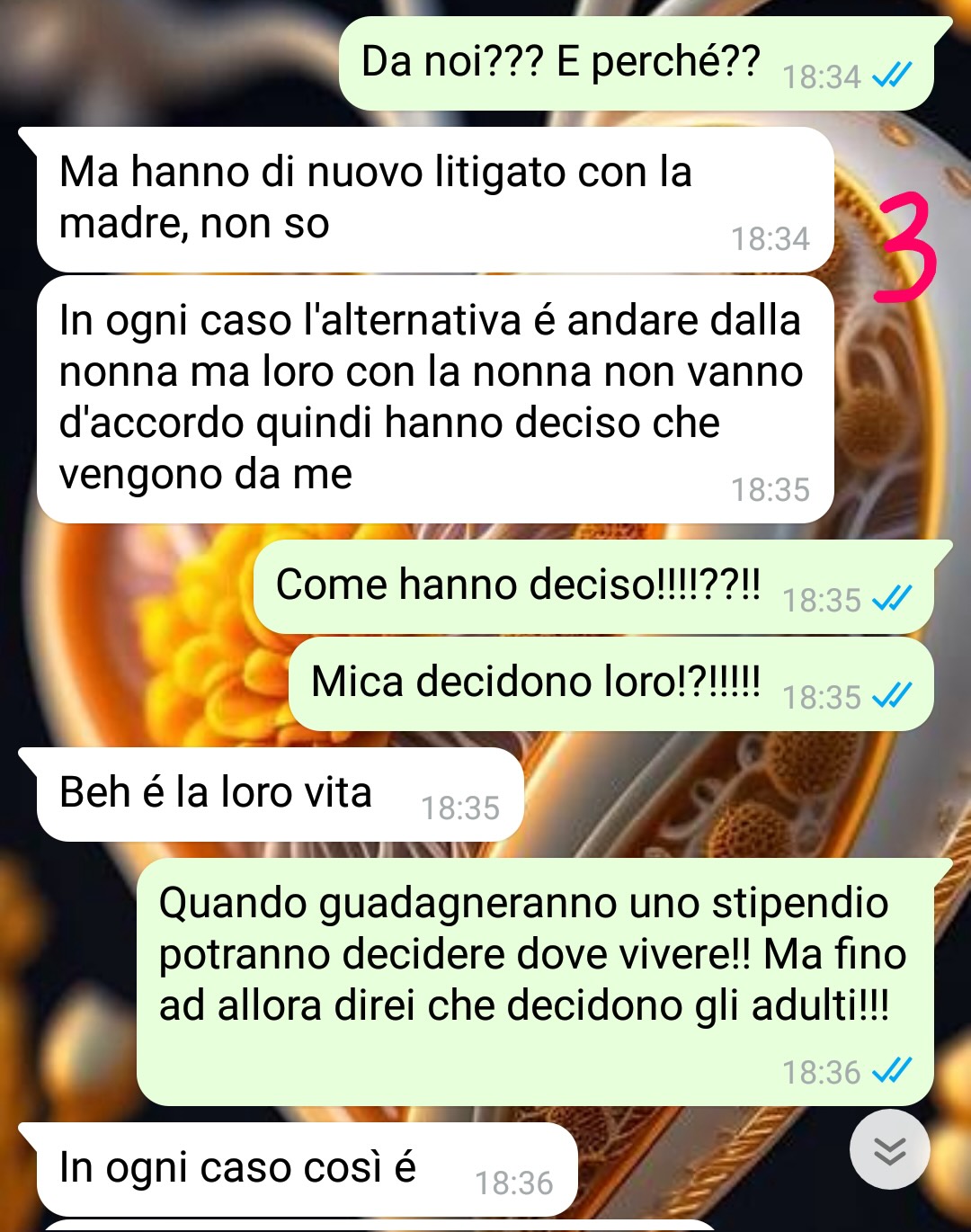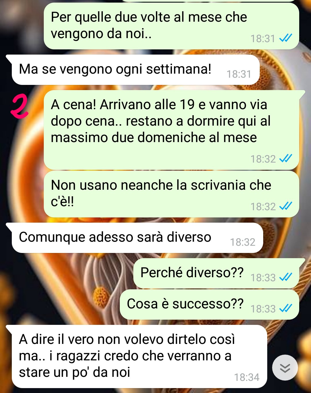 Mi chiamo Susanna e sono sposata da 5 anni con Enzo. Dovete sapere che mio marito è già stato sposato, io sono la sua seconda moglie: quando l’ho conosciuto lui era già divorziato da 10 anni, il suo primo matrimonio di fatto è durato meno di un anno. Ora Enzo dalla sua prima moglie ha avuto due figli, due gemelli maschi. Lui dice sempre che la causa del divorzio sono stati proprio i figli: loro erano troppo giovani e non erano pronti a diventare genitori.. così la loro storia è andata in pezzi. Il problema è che sti due figli sono stati cresciuti.. come si fa con le piante!! V oglio dire nessuno gli ha mai dato un’educazione: si sono limitati a nutrirli e mandarli a scuola nella speranza che qualcuno gli insegnasse a vivere!! Conclusione?!? I due ragazzi, che ormai hanno 18 anni, sono del tutto ineducati!! Per fortuna vengono da noi raramente, infatti non hanno tutto sto interesse a vedere il padre, ma quando capita è un incubo: buttano tutto per terra e sporcano, fumano in casa anche se gli si dice di non farlo (e buttano le cicche sul pavimento!!), mettono le mani nei nostri armadi prendendo cose senza chiedere e, se per disgrazia dormono da noi, la notte fanno un casino infernale! Quindi capirete perché ho dato di matto quando qualche giorno fa..