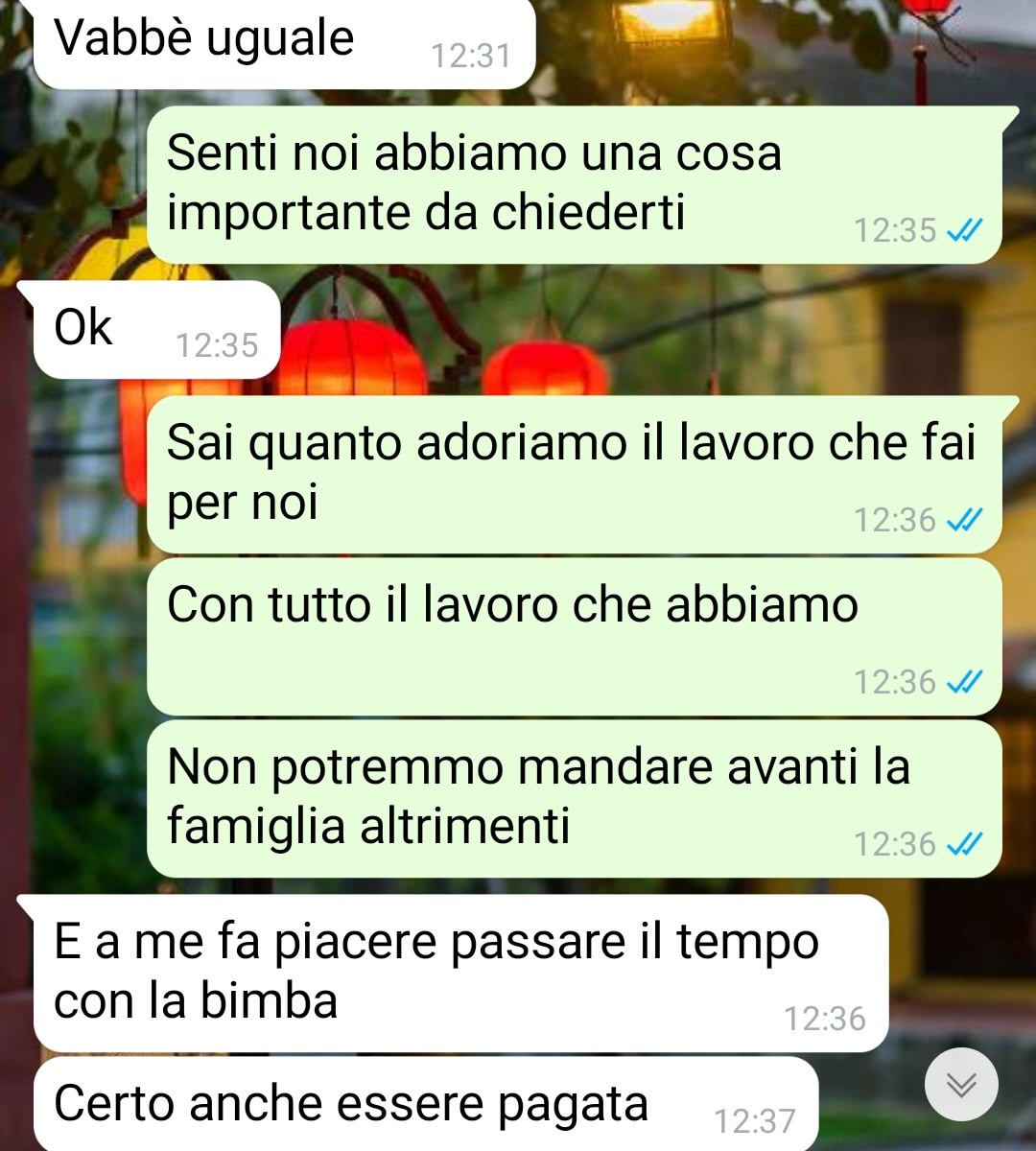 Sono Viviana e sono proprio curiosa di sapere da parte vostra cosa pensate di me e di quello che mi è successo. Il motivo principale per cui vi mando questa storia è questo, ma siccome non sono davvero così autolesionista e non ci tengo a essere insultata per come faccio la madre, allora mi è stato consigliato di inviare la storia a voi per liberarmi anche un po’ di un peso che mi sta opprimendo. Perché comunque è vero che io non sono una che si lascia condizionare spesso, ma ammetto che le parole che mi sono state rivolte, le accuse e le cattiverie dette, mi hanno colpita negativamente e ho bisogno di sfogarmi a parlarne con un pubblico più ampio di un paio di amiche che dicono quello che mi aspetto. Il discorso è che io sono sposata da tre anni e ho una figlia di un anno e mezzo, è la mia luce e non so come farei senza di lei, ma sono anche una donna in carriera e dato che mio marito lavora pure devo cercare di gestirmi in ogni modo possibile. Per questo motivo la affido a una persona di estrema fiducia, la migliore amica di mio marito, che conosciamo da tipo 15 anni o più. Lei è fantastica e ci sa fare davvero tantissimo, ma di recente abbiamo litigato perché le ho detto che avevo bisogno di lei per una cosa speciale e speravo avrebbe detto sì. Non solo ha detto no, ma si è anche arrabbiata che non vi dico.
