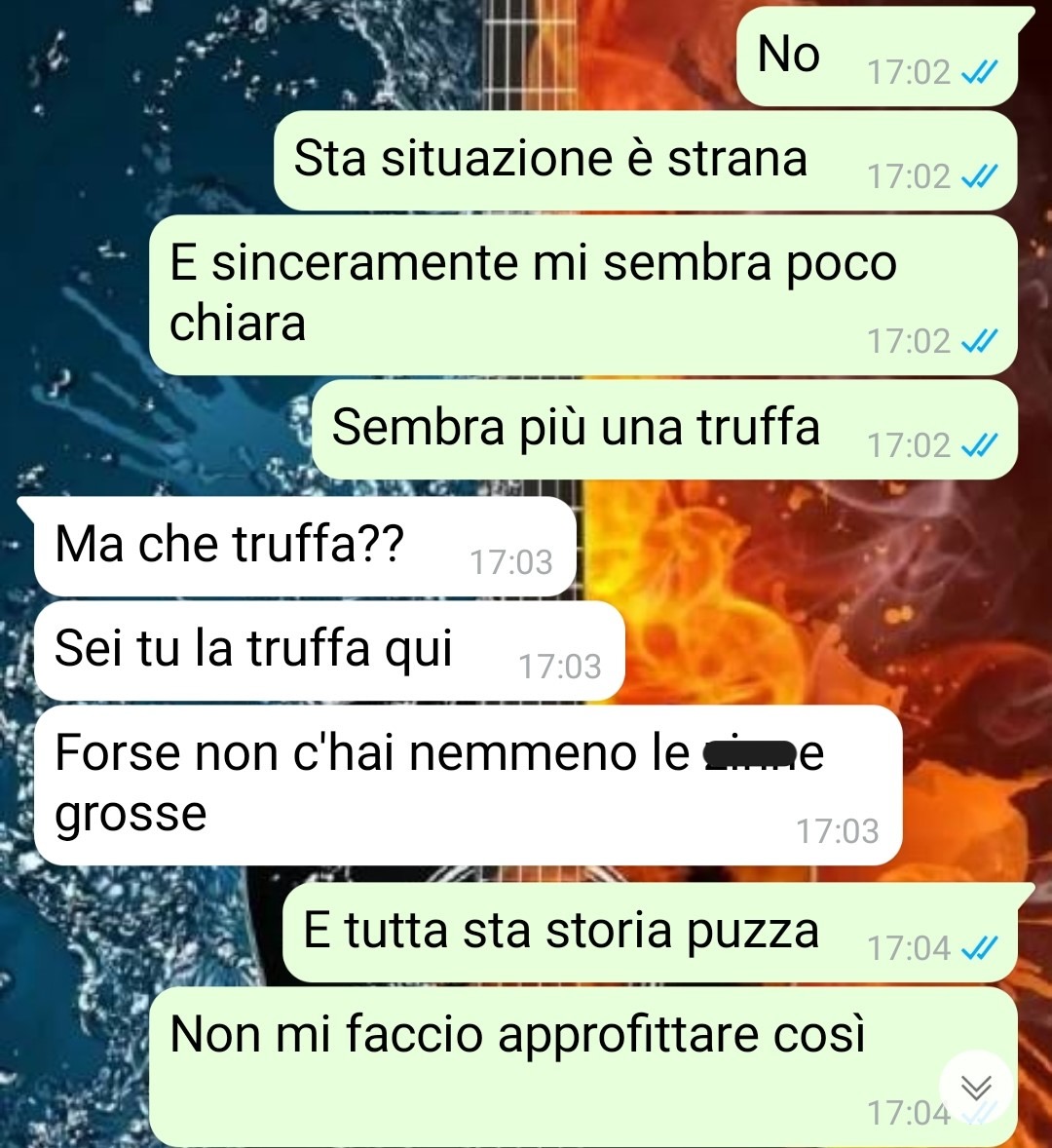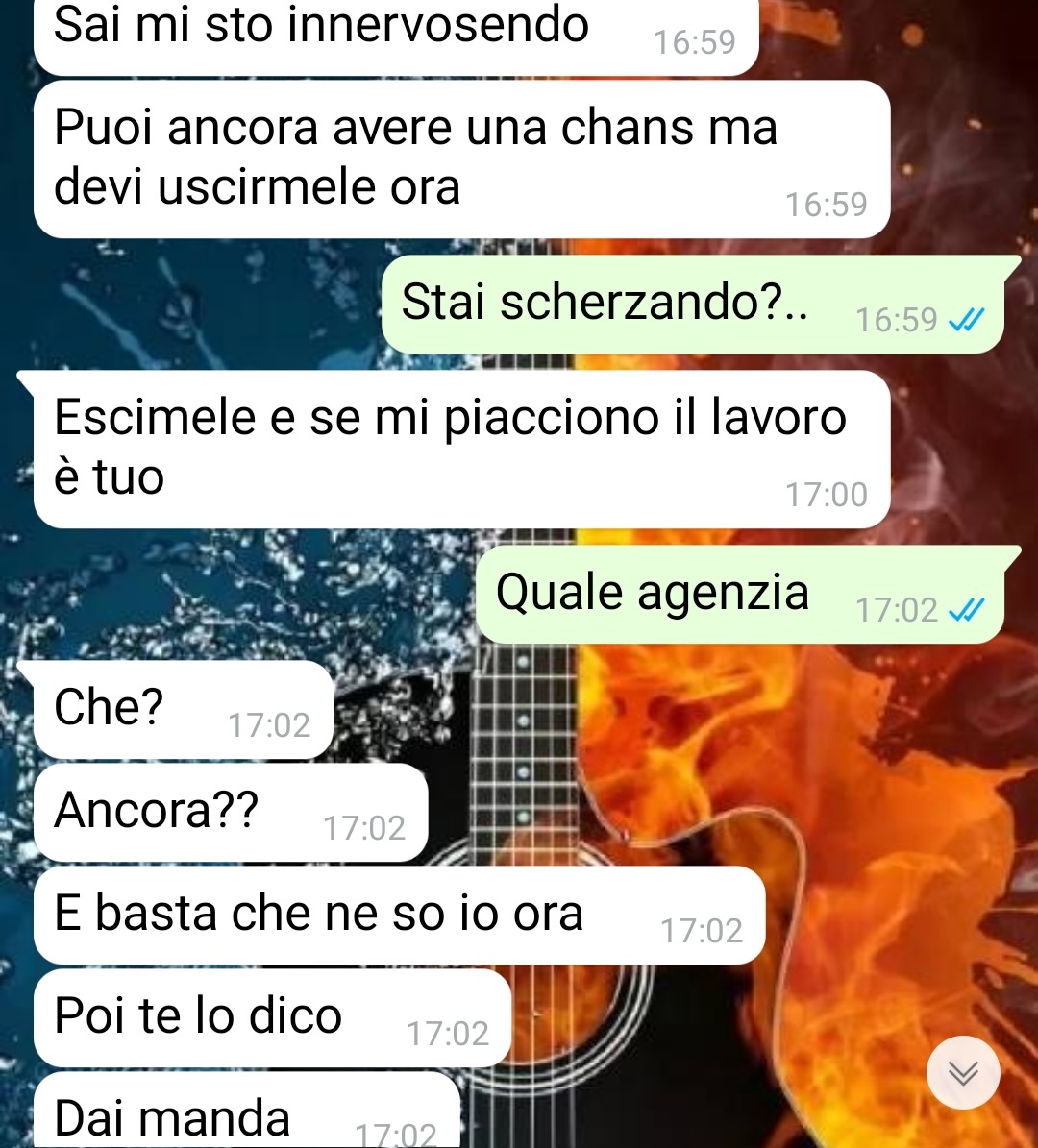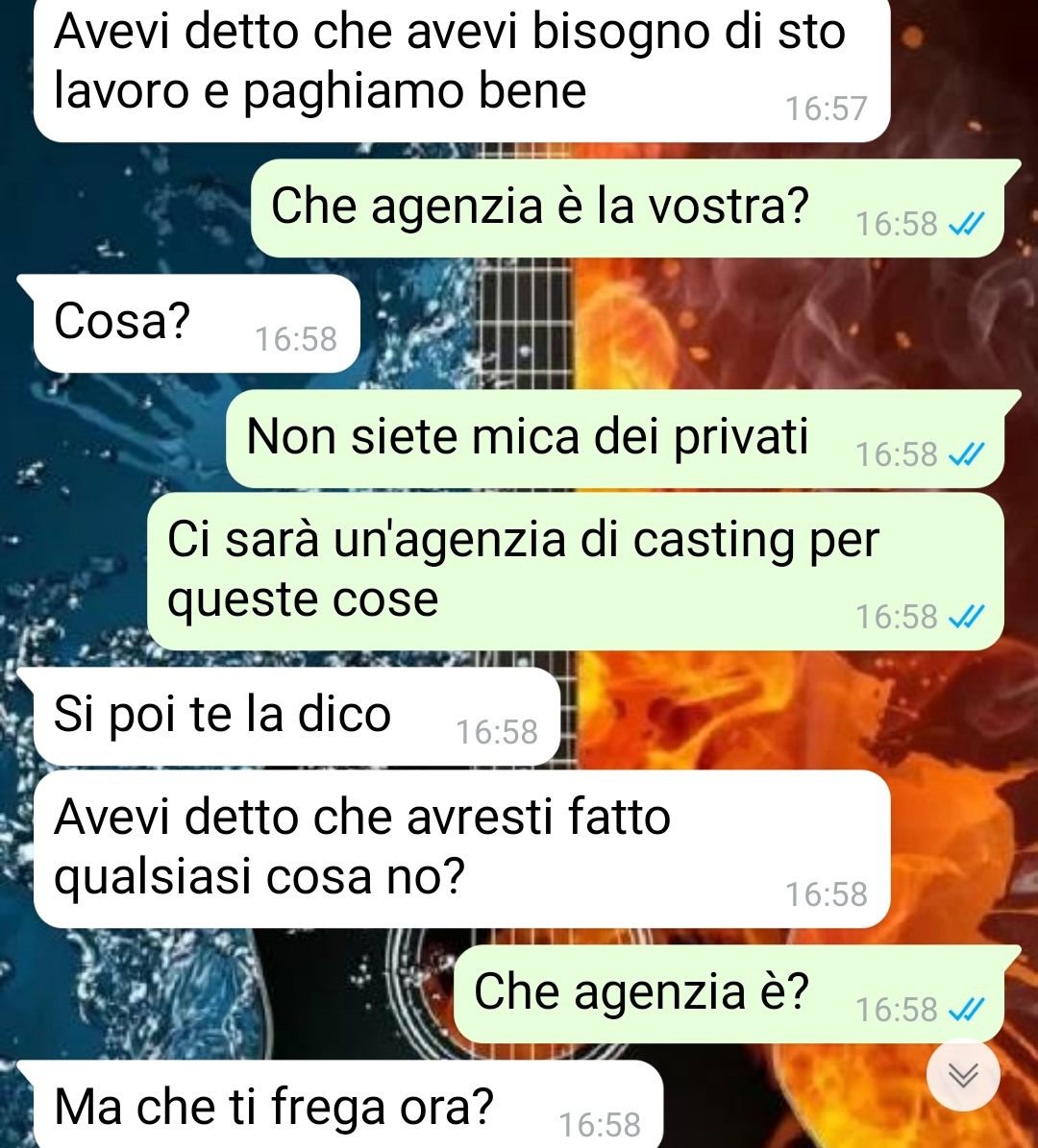 Il racconto prosegue con ulteriori dettagli sulla conversazione avvenuta tramite messaggistica istantanea, che ha confermato i timori iniziali. Un episodio che lascia emergere quanto sia importante la tutela nel mondo del lavoro, soprattutto in settori dove spesso si tende a sottovalutare i rischi dietro a offerte apparentemente innocue.