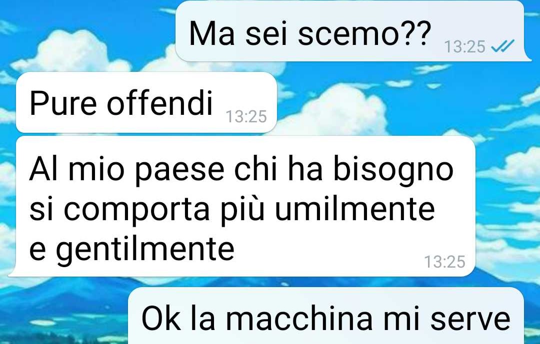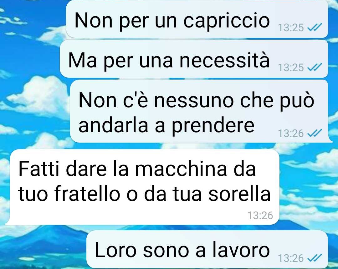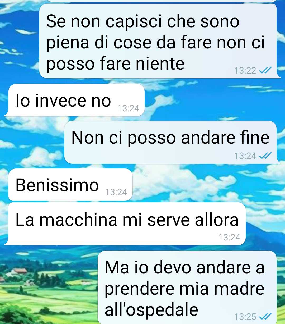 Nonostante il carico emotivo e lavorativo della giornata, si è fatta carico del compito di accompagnare la madre, non potendo contare su altri. Eppure, il suo compagno ha reagito con fastidio, come se avesse disatteso un ordine. Un atteggiamento che la nostra utente definisce ironicamente da “sultano”, sottolineando quanto lui si aspetti obbedienza e disponibilità totali, pur non facendo praticamente nulla dalla mattina alla sera.