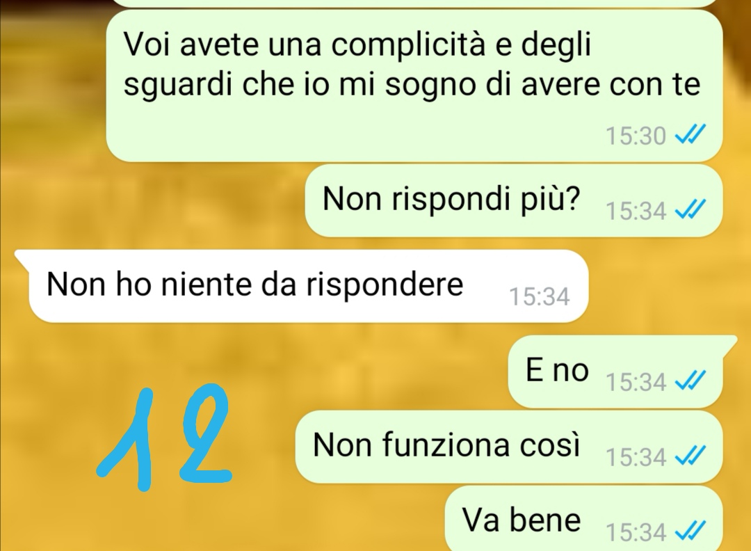 Fin dall’inizio, la nostra amica ha notato che Federico non era particolarmente affettuoso. Nonostante ciò, ha deciso di continuare a frequentarlo, anche se non rispecchiava del tutto l’idea che aveva del compagno ideale. Riconosceva però che, rispetto ad altre esperienze, lui si dimostrava più presente. Con il passare del tempo, ha iniziato a tollerare comportamenti che, forse, non avrebbe dovuto accettare. Tra questi, uno in particolare, che emerge in modo evidente nella conversazione condivisa.