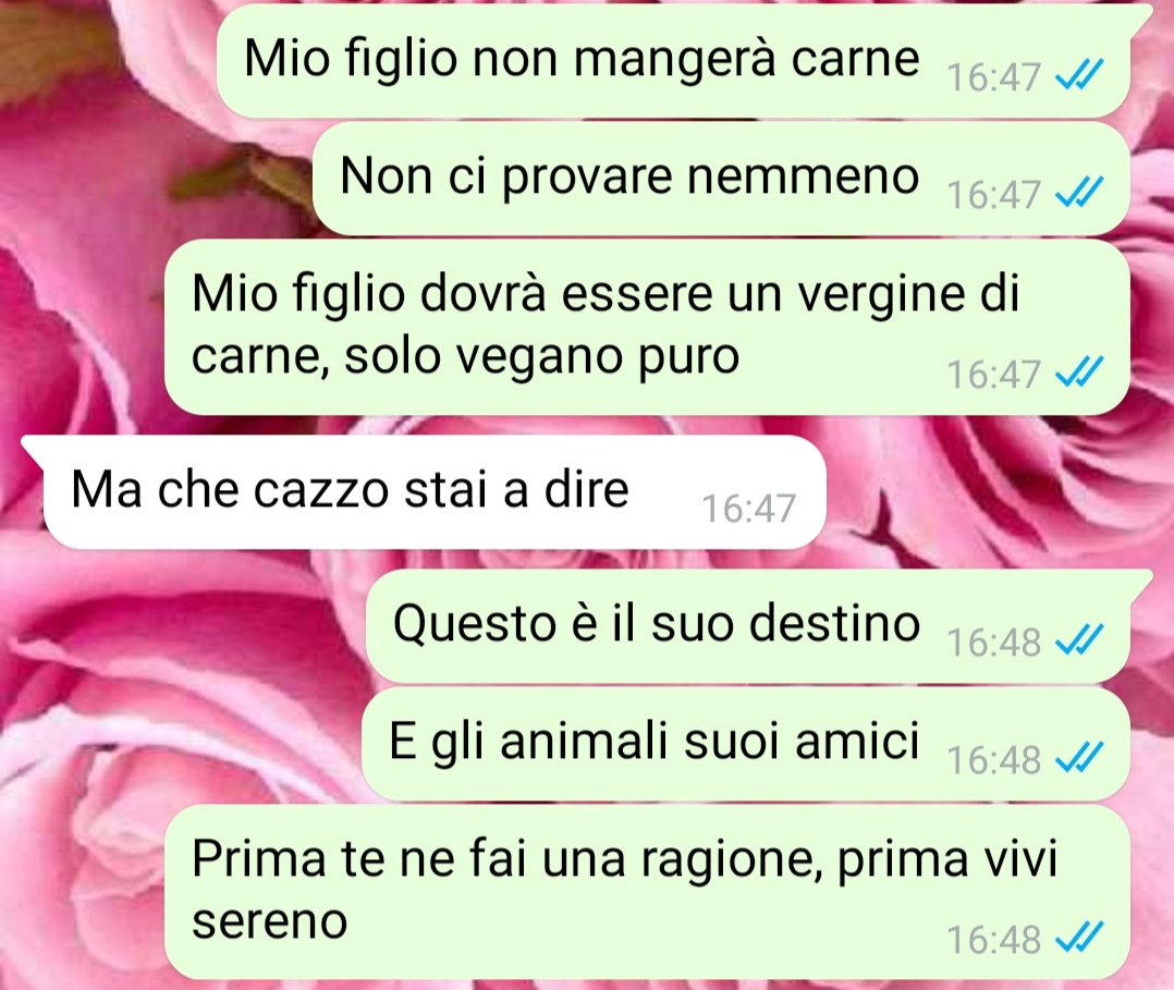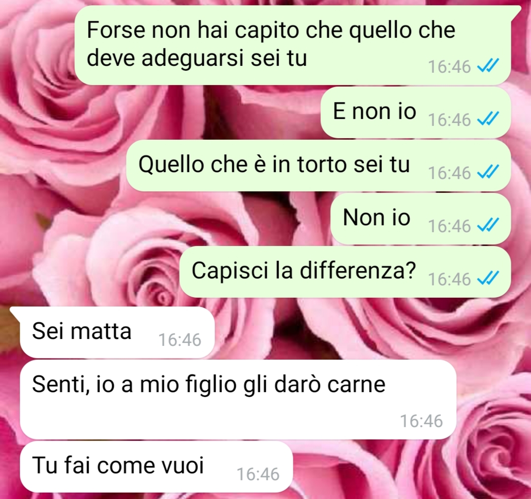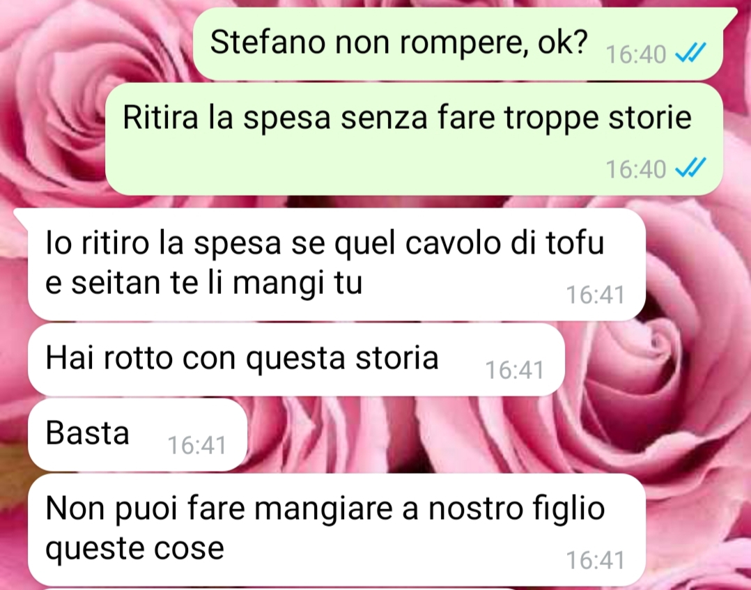 “Beh che dire, ci risiamo, mio marito non fa altro che boicottare la nostra scelta. Non comprende che essere vegani è uno stile di vita che possiede una marcia in più rispetto all’alimentazione onnivora. Questa cosa mi sta davvero infastidendo, poiché non coglie l’occasione per criticare i cibi vegani che sono gustosi, salutari e soprattutto naturali per l’uomo. Mangiare carne non è normale!!!! Ma lui non lo capisce. Mio figlio non mangerà mai e poi mai un essere vivente, e il mio piccolo ha semplicemente deciso di essere vegano, io non mi permetterei mai di imporre nulla. Come faccio a fare cambiare idea a mio marito??”