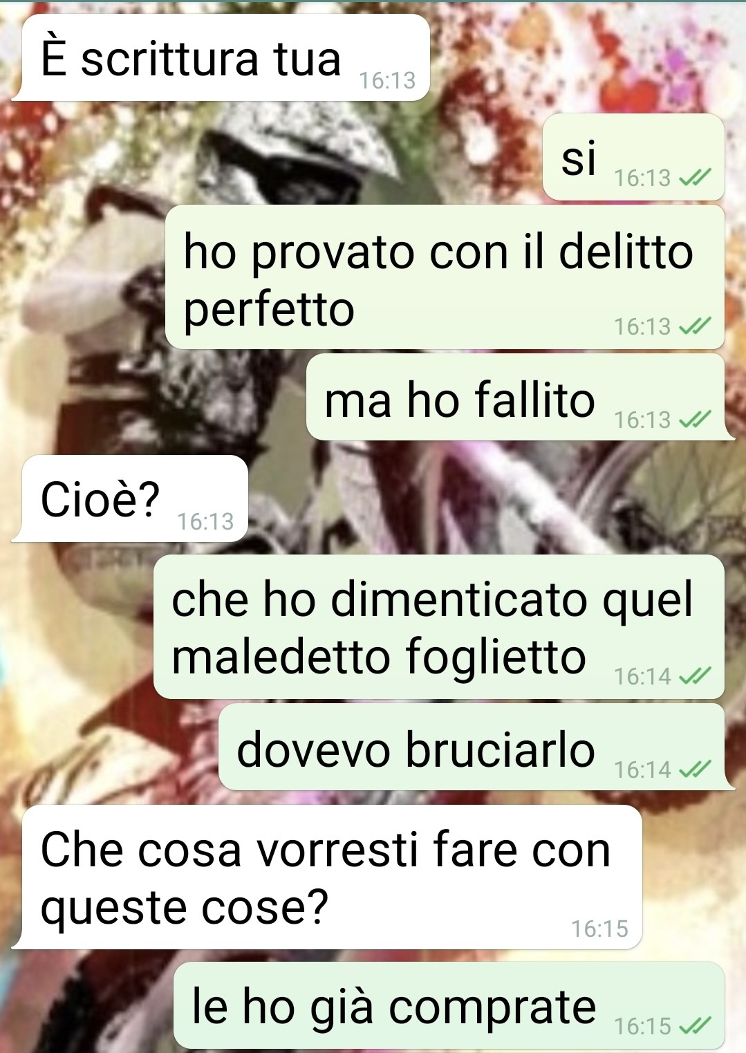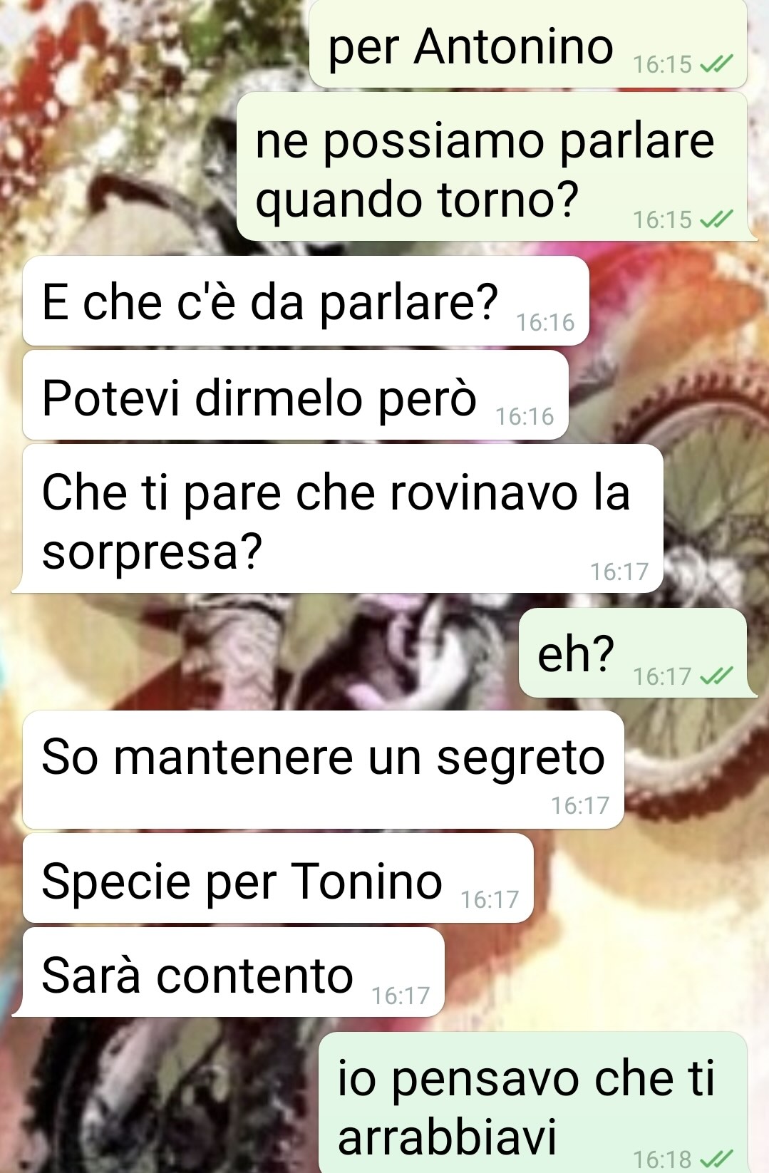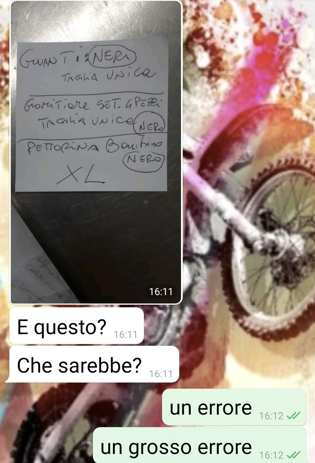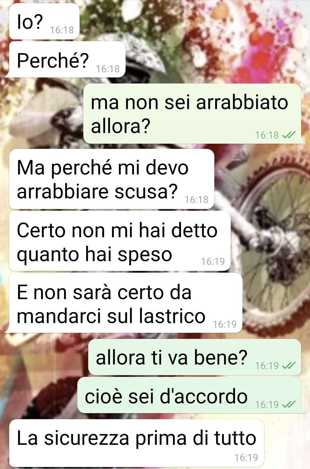 Mio marito era contentissimo e mi ha addirittura elogiato per degli acquisti che ho fatto per nostro figlio. Ma non aveva inteso bene a cosa servissero… Io sono Katia e vi invito a leggere questa chat che definisco tragicomica. Tutto avviene ieri pomeriggio, mentre sono dai miei genitori, e lui torna a casa. E trova un biglietto con una lista di cose da comprare. Avevo dimenticato di cestinarlo. E mi scrive subito. Inizialmente ho sudato freddo, perché era chiaro che erano protezioni per il nostro Tonino. E lui che è tutto timoroso di ogni cosa non poteva certo prenderla bene. Cioè io sono una crossista, ho la mia moto, quando posso pratico assiduamente, mi infortuno anche… Ho pensato che mi avrebbe piantato un casino assurdo. Invece mi elogia! Ci ho messo 2 secondi a capire che aveva frainteso tutto. Ma ho cercato di assecondarlo. Niente, la bomba è esplosa poco dopo. Uno strazio, tanto le sue paure quanto il non sapere a che punto di esperienze sta Tonino.