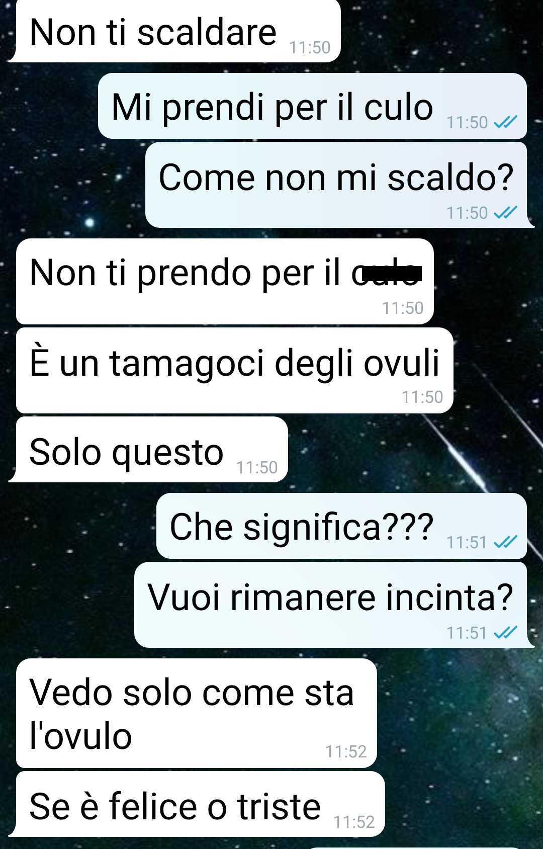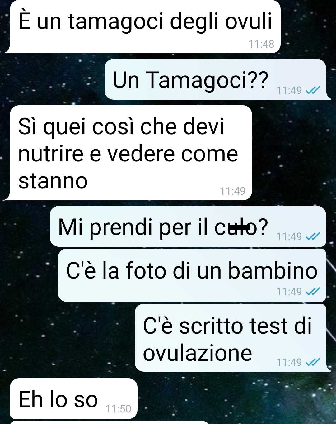 La mia ragazza sta usando un TAMAGOCI degli ovuli. Sono in un mare di guai. La mia ragazza ha dormito da me. In mattinata poi se n’è andata. In bagno ho trovato delle cose sue. Non ho capito subito cosa era e mi sono messo a piscia**. Poi mi è venuto un flash, tipo una scarica di consapevolezza tutta insieme. Quelle cose sue erano un test di ovulazione Le ho chiesto spiegazioni. Perché aveva lasciato un test di ovulazione usato sul ripiano del bagno??? Lei mi ha detto, con un candore che rasenta la stupidità o la furbizia più meschina, che si trattava di un tamagoci. Sì, avete letto bene. Uno di quei giochi anni novanta. Non so se li fanno ancora, forse sì. Uno di quei giochini elettronici dove c’è un animaletto digitale e tu lo devi curare, dandogli da mangiare ecc. Lei dice che quel coso che ha lasciato sul ripiano in bagno è un tamagoci per gli ovuli. Sto con lei da qualche mese e non so che pensare. So solo che in questo momento ho un solo pensiero. Un solo grande catastrofico pensiero!!