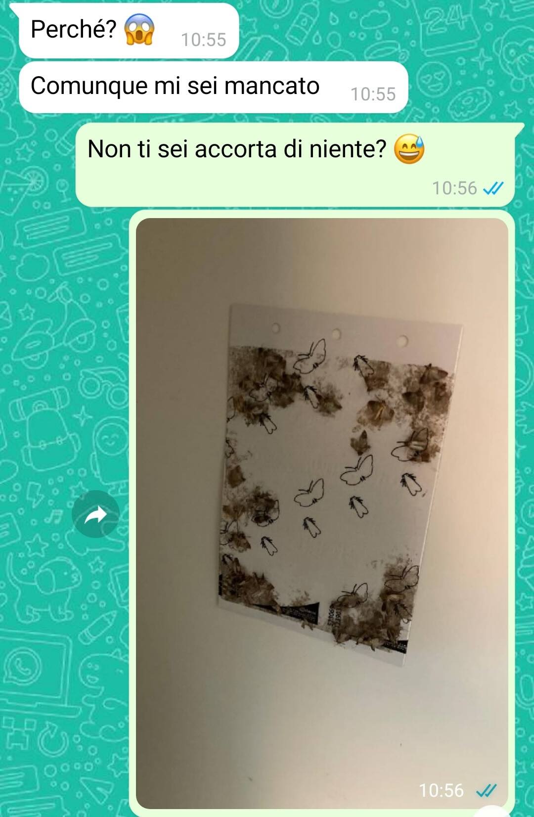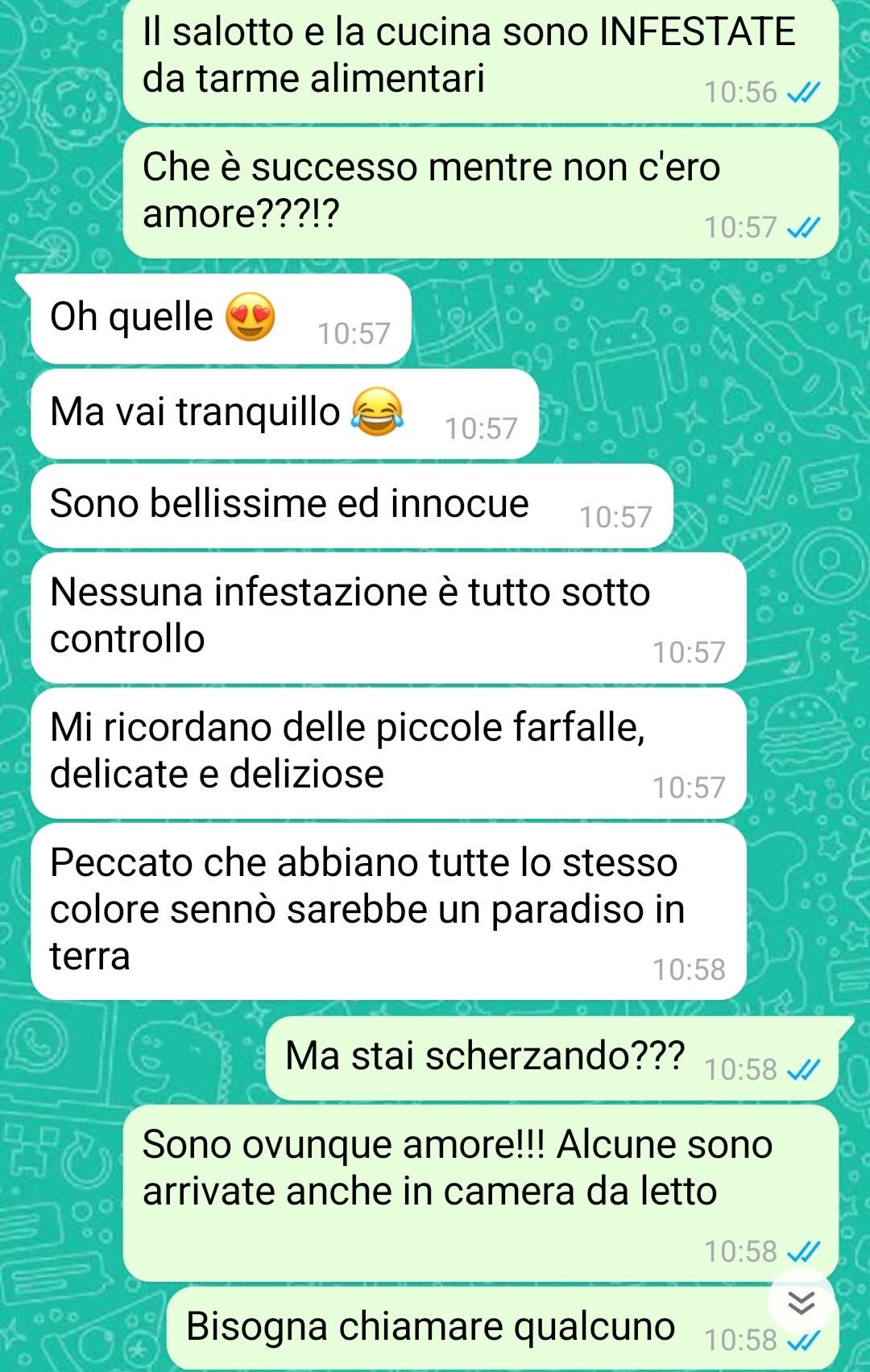 Sono una persona semplice e quando posso (non in senso egoistico ma nel senso che non sempre mi è possibile) faccio qualcosa per il bene del mondo, perché so bene quanto il nostro mondo ne abbia bisogno. Nonostante ciò, ci sono dei limiti, soprattutto legati al buon senso, che devono essere rispettati, a prescindere da tutto. E questi limiti sono spesso legati anche all’igiene, alla salute e al normale modo di comportarsi di noi esseri umani. Mi sono allontanato da casa per due settimane, per lavoro, ed ero ben felice di tornare. Purtroppo questa felicità è durata molto poco. Sono tornato e ho trovato la casa infestata da tarme alimentari. E se dico infestata è perché era infestata forte, fidatevi. Scrivo subito alla mia moglie per capire cosa fosse successo ma, con mia grande sorpresa, la situazione era ben diversa e ben più grave di quanto potessi immaginare. Io capisco tutto e sono davvero aperto ad ogni cosa, ma non mi era mai capitato niente di tutto ciò, soprattutto con lei che, difetti e qualche fissazione a parte, è sempre stata una persona equilibrata.