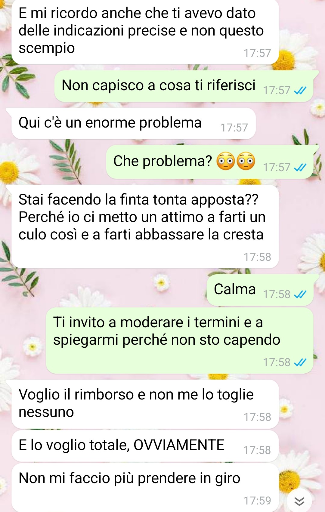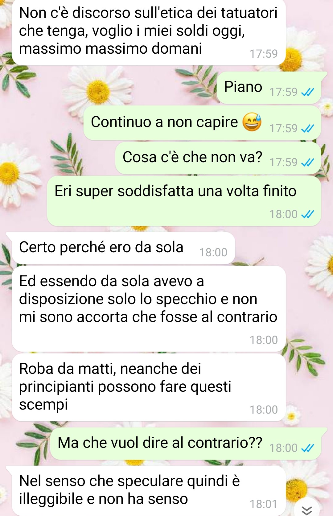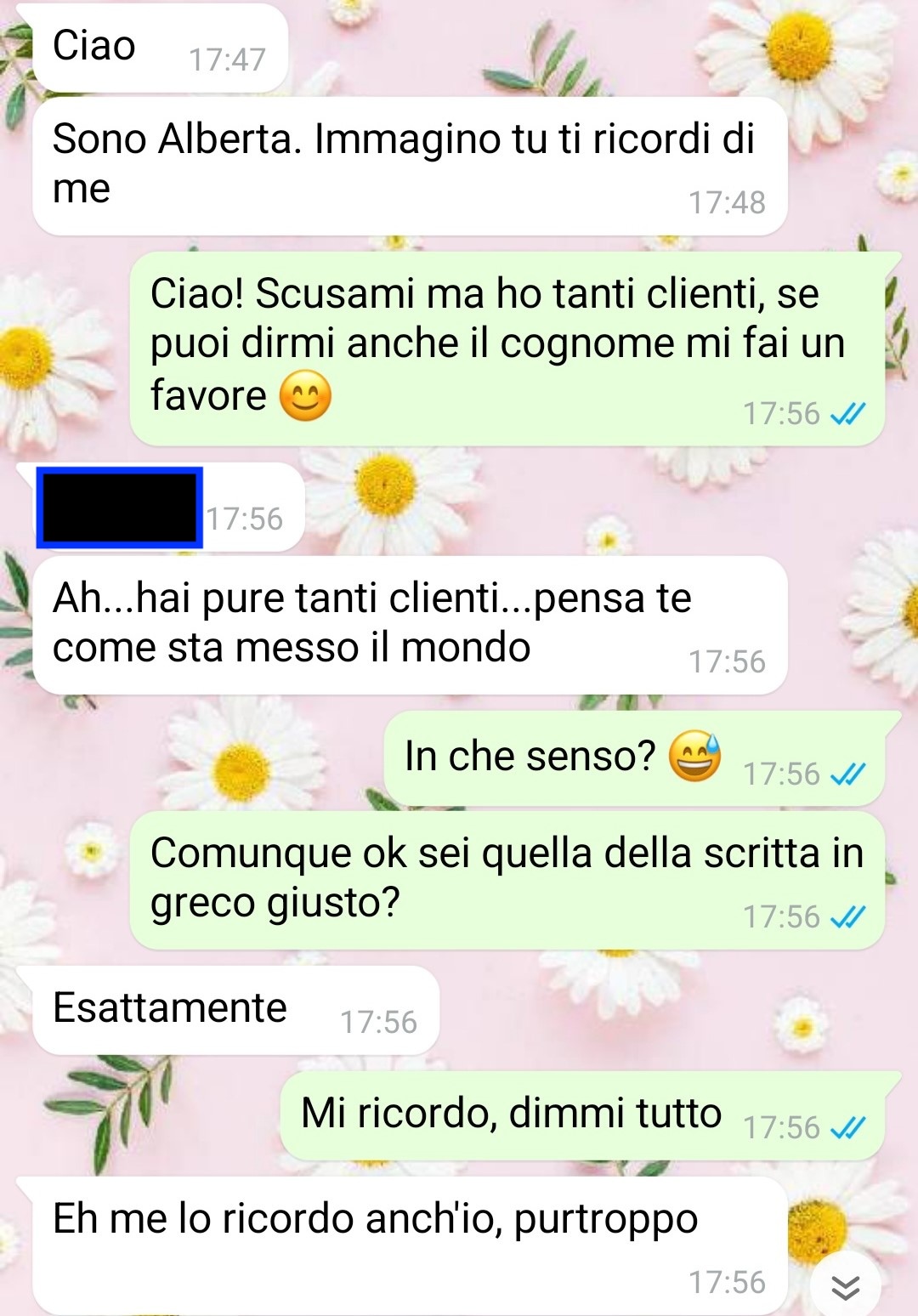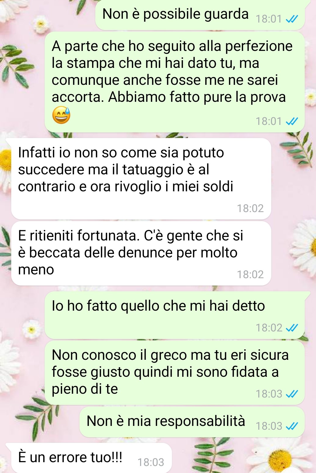 Mi chiamo Marika e sono una giovane tatuatrice che è partita da zero ed è riuscita a crearsi una piccola attività dal nulla, con tanto lavoro, studio, impegno e fatica e che, anche fortunatamente, ora funziona abbastanza bene. Ovviamente, soprattutto di questi tempi, il parere dei clienti, così come le loro recensioni con tanto di foto, in uno studio di tatuaggi, sono assolutamente fondamentali e quindi io personalmente mi impegno sempre al massimo per ottenere la piena soddisfazione di chiunque venga a tatuarsi da noi. Non molto tempo fa mi contatta una ragazza che mi chiede di tatuarle una scritta in greco. Io nono conosco il greco ma lei mi avrebbe portato la stampa o un’idea di essa, quindi, essendo io specializzata in scritte, non mi sembrava un lavoro difficile, e così è stato, è stato semplice ed è venuto bene. Il problema è che la stessa cliente, circa un paio di giorni dopo essersi tatuata da me, mi scrive furiosa accusandomi di qualcosa che, anche per le prove che la stessa ha cercato di portare in suo favore, ritengo assurdo. Purtroppo il cliente peggiore possibile è sempre il prossimo e mai uno che c’è già stato ma qui ci siamo andati vicini.