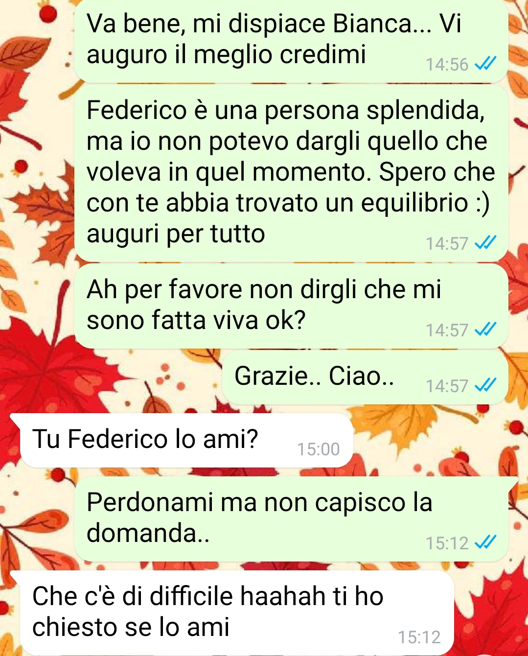 La nostra follower Valentina racconta di una storia d’amore particolare che ha voluto condividere con Commenti Memorabili. La giovane aveva una relazione con Federico, che definisce l’amore della sua vita, ma nel 2020 ha dovuto prendere una decisione difficile. L’amica era concentrata sui suoi obiettivi universitari e si rendeva conto di essere spesso nervosa e distaccata quando stava con il fidanzato. La situazione la portava a essere profondamente insoddisfatta della vita che conduceva e di se stessa, tanto da sentire il bisogno di dare una svolta alla propria esistenza.
