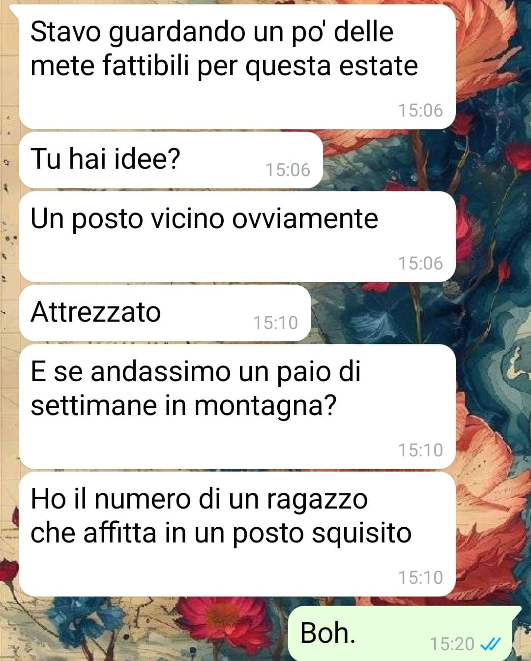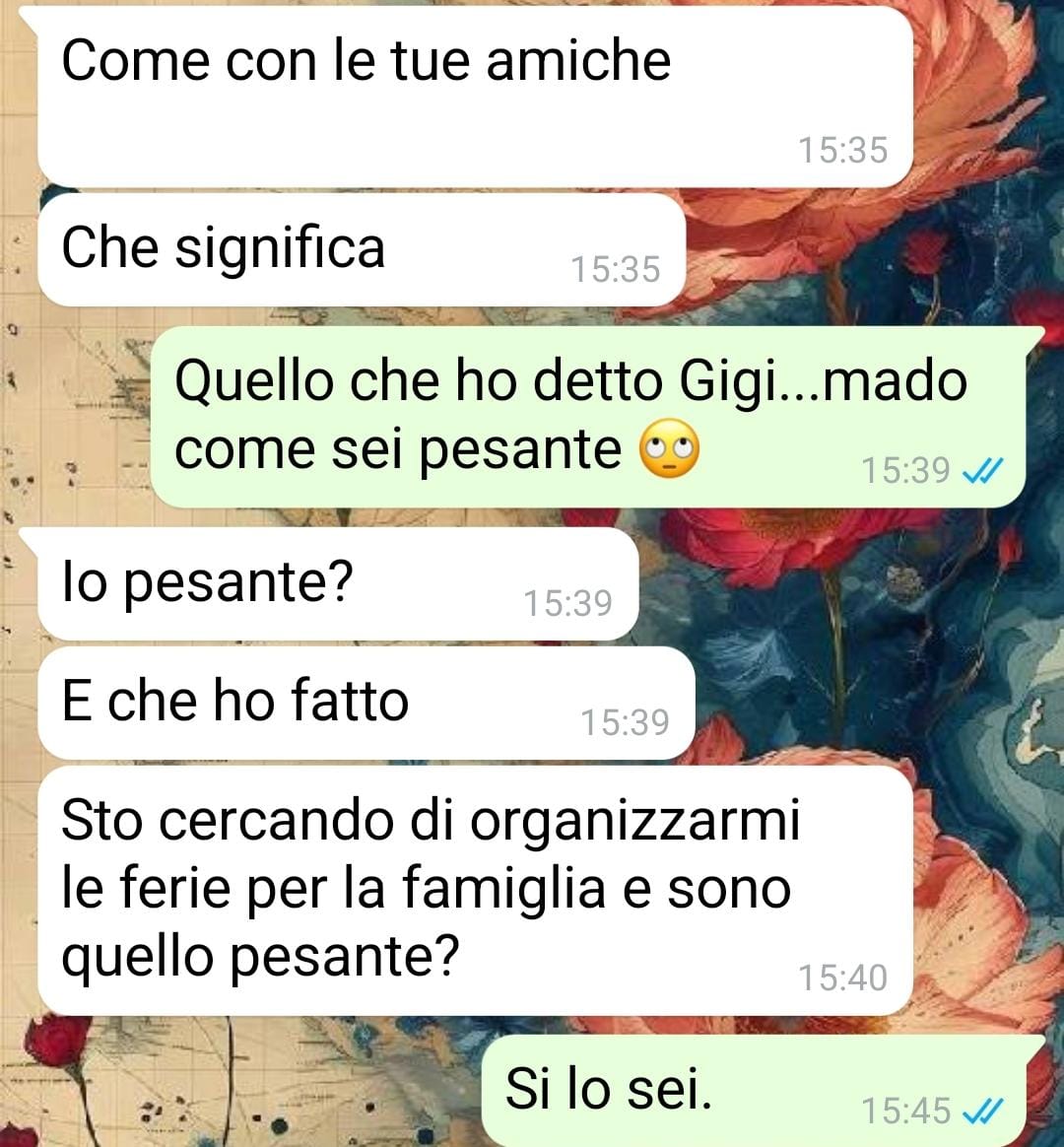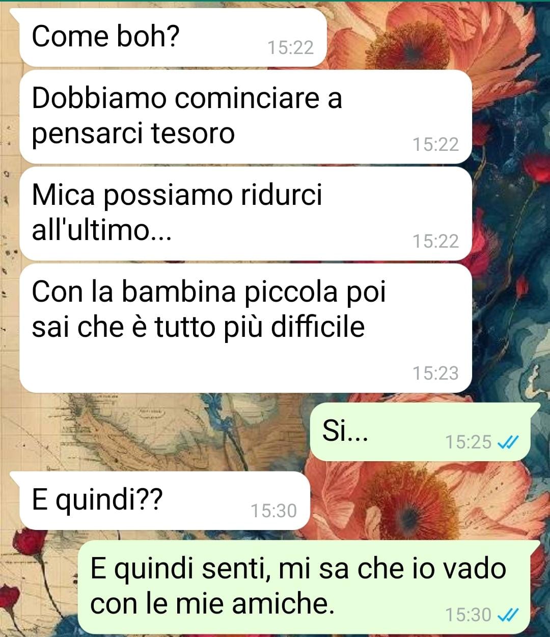 Il mio compagno non mi capisce più. Tempo fa stavamo benissimo. Poi abbiamo voluto fare una figlia e le cose sono cambiate. Ok sapevo che sarebbe stato impegnativo, ma non immaginavo così tanto. Cioè, ci si aspetta da me solo perché sono la madre, che devo rinunciare a tutto ciò che riguarda la mia vita personale? Io non lo trovo per niente giusto. E sarebbe anche un esempio negativo per mia figlia, che imparerebbe solo a mettersi da parte. Il mio compagno Gigi usa per tutto la stessa solita scusa: lui lavora, lui fa cose per Tea, e quindi anche io dovrei pensare solo alla bambina, perché non vado più a lavorare. Ma sapete che vi dico? Che lavorare forse era meglio, nessuno mi chiedeva di rendergli conto del mio tempo. Adesso ovunque vado da sola mi chiedono tutti: “E Tea?” Ha anche un padre, fortunatamente. Io ho provato a parlare con Gigi, a dirgli che mi sento oppressa dalla routine e da tutte le aspettative che si hanno su di me come madre. Ma lui è sordo. E adesso mi vuole punire. Perché quello che mi ha detto credetemi che lo ha fatto come punizione nei miei confronti. Adesso devo pensare a come fare, io non voglio dargliela vinta.