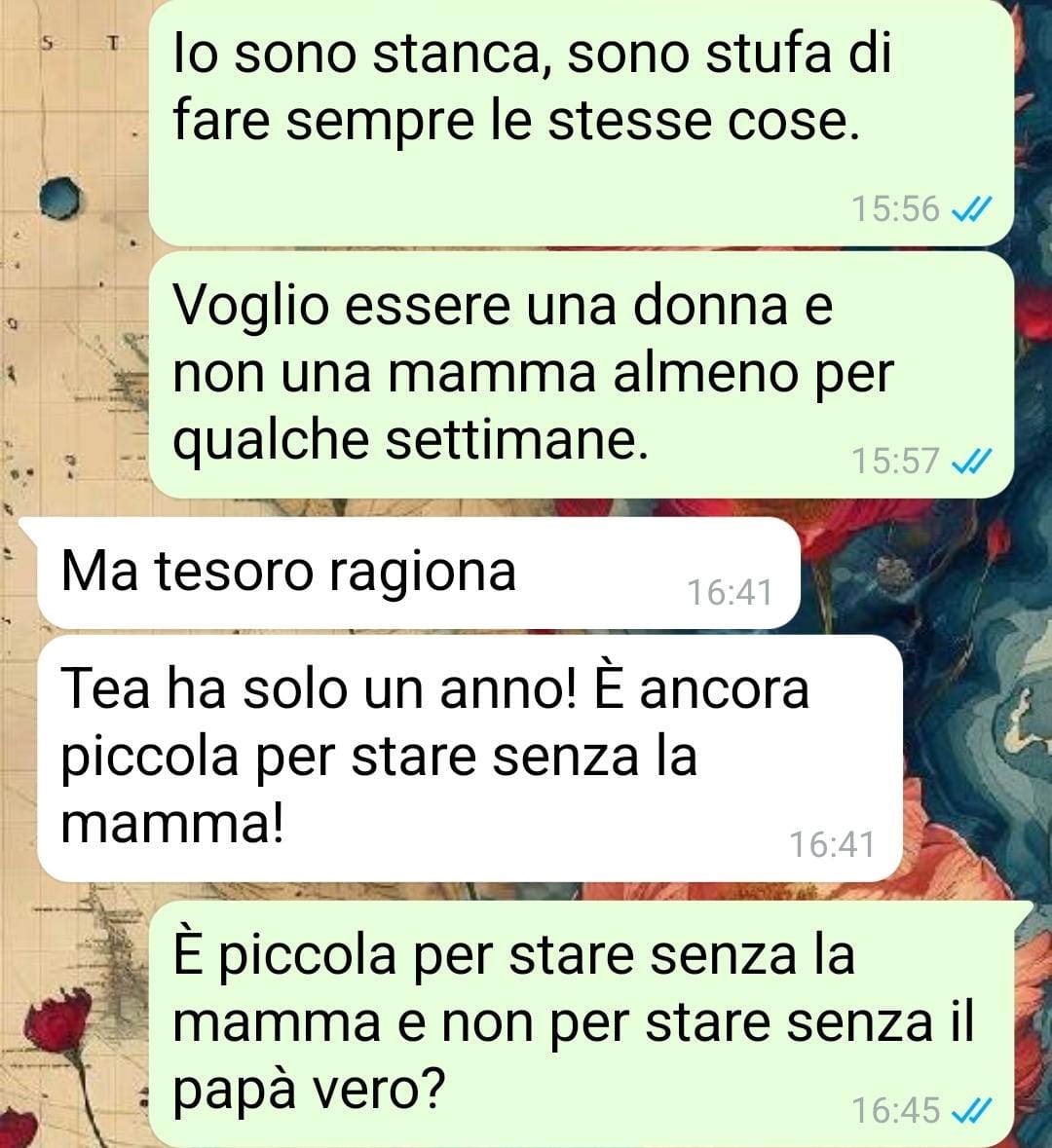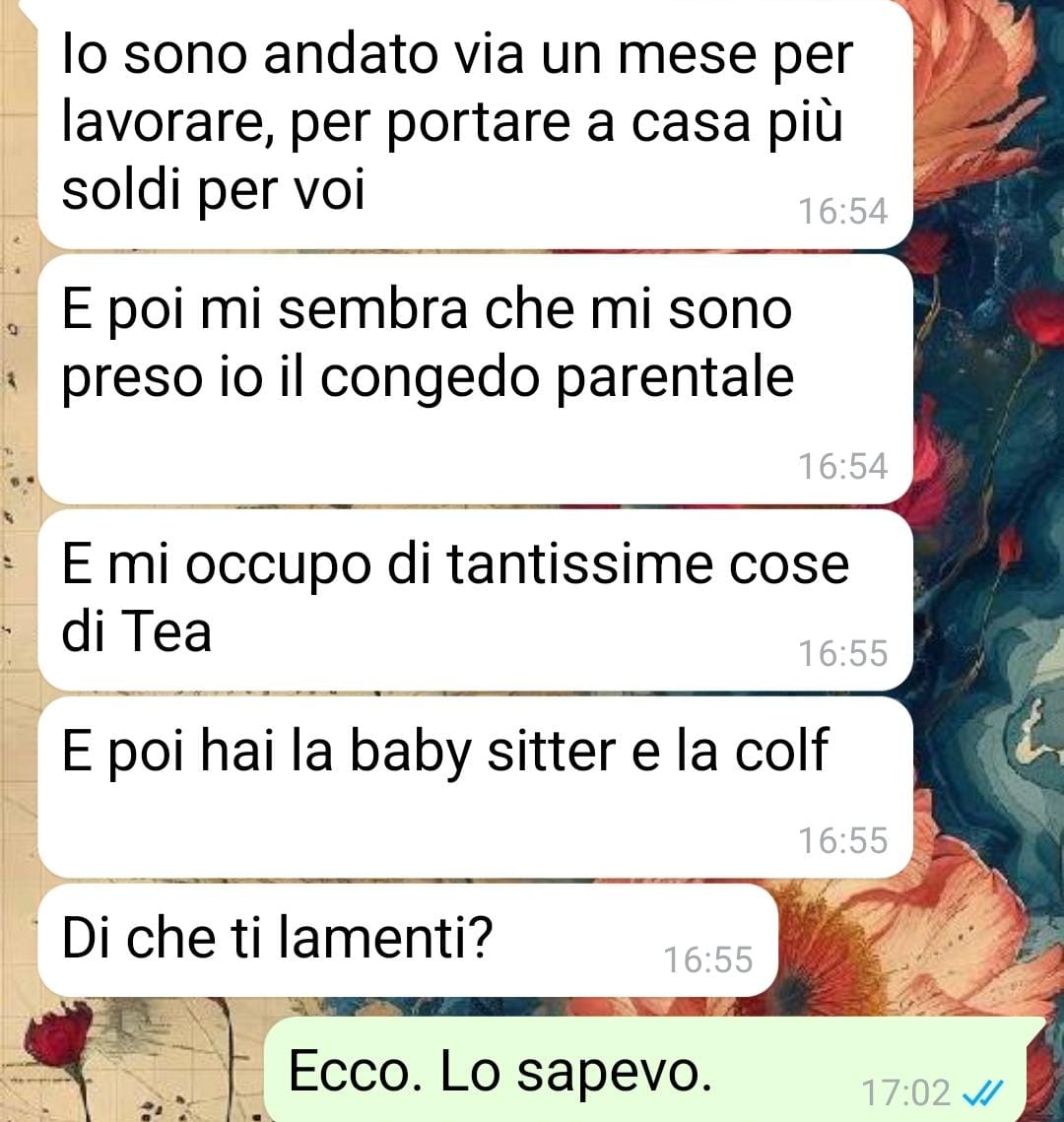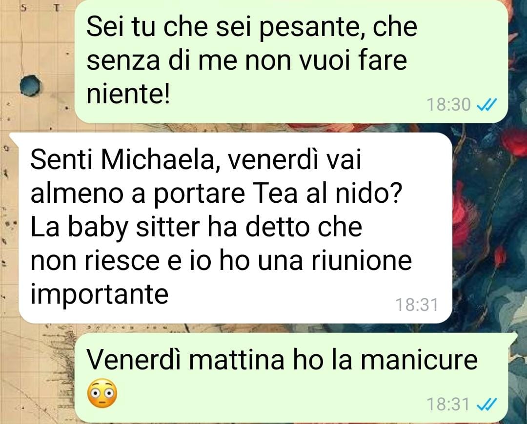 Secondo quanto racconta, Gigi giustifica la sua posizione sempre allo stesso modo: dice di lavorare, di occuparsi comunque della bambina e per questo si aspetta che lei, non lavorando attualmente, si dedichi completamente alla gestione di Tea. Ma questa visione, per la nostra follower, è profondamente sbilanciata e ingiusta.