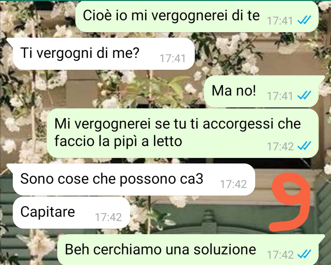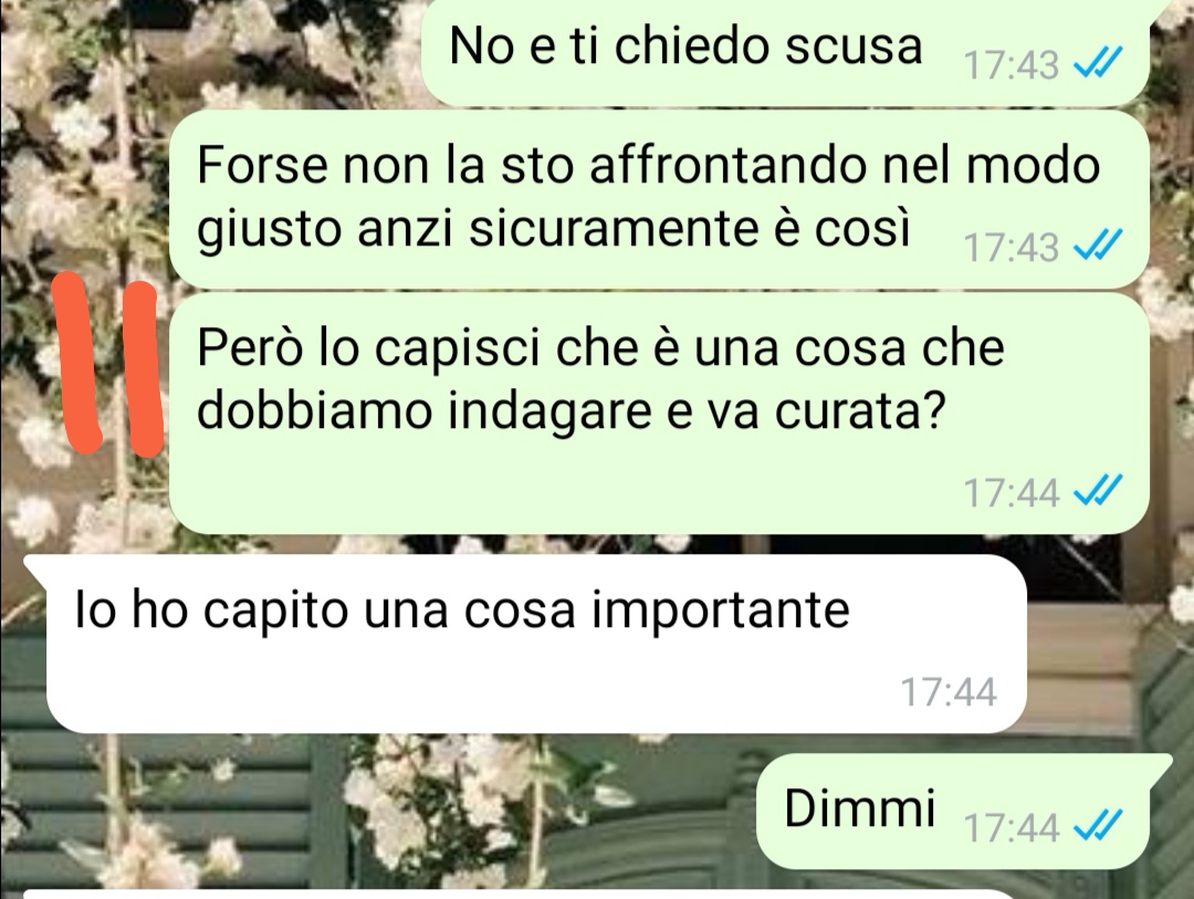 Alla base del suo disagio c’è un bisogno di comunicazione e di comprensione, che purtroppo ha trovato davanti a sé una persona poco incline ad affrontare i problemi seriamente. Nonostante l’imbarazzo iniziale, ha cercato di aprire un dialogo, rendendosi conto che la questione non poteva essere gestita da sola e che forse era arrivato il momento di chiedere aiuto.