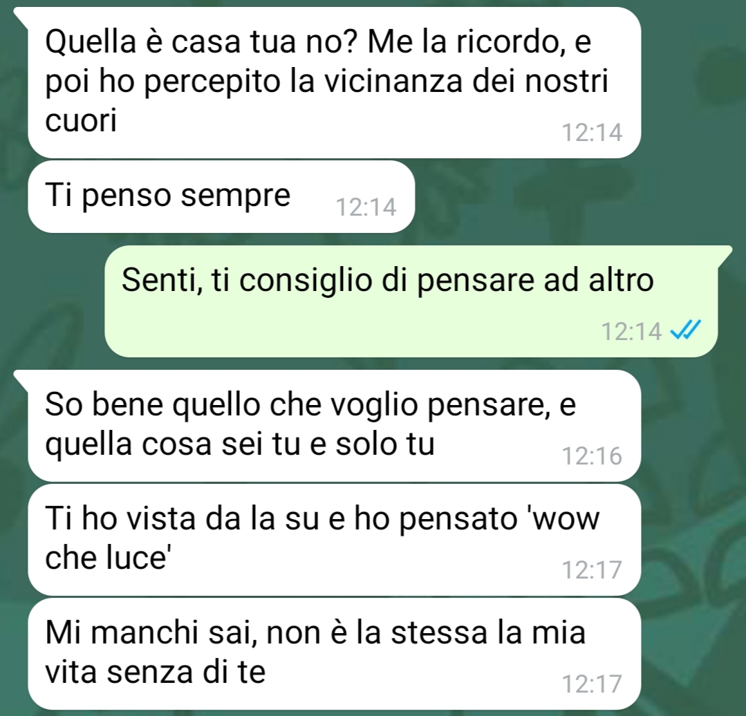 “Ciao, mi chiamo Roberta e sono davvero perplessa dal comportamento del mio ex ragazzo. Io dico: se sì chiamano ex un motivo vi sarà, no? Ecco lui vuole essere differente, pensa di avere la soluzione in mano o così crede. Vi invio la nostra (spero) ultima conversazione che abbiamo avuto qualche giorno fa, quando lui ha iniziato a farmi la morale su quanto io sia la ragazza perfetta per lui e lui per me. Si ma se io non lo voglio che devo fare? Vi è mai capitato di avere degli ex insistenti e psicopatici? In un certo senso mi fa anche tenerezza, ma quando è troppo è troppo..”.