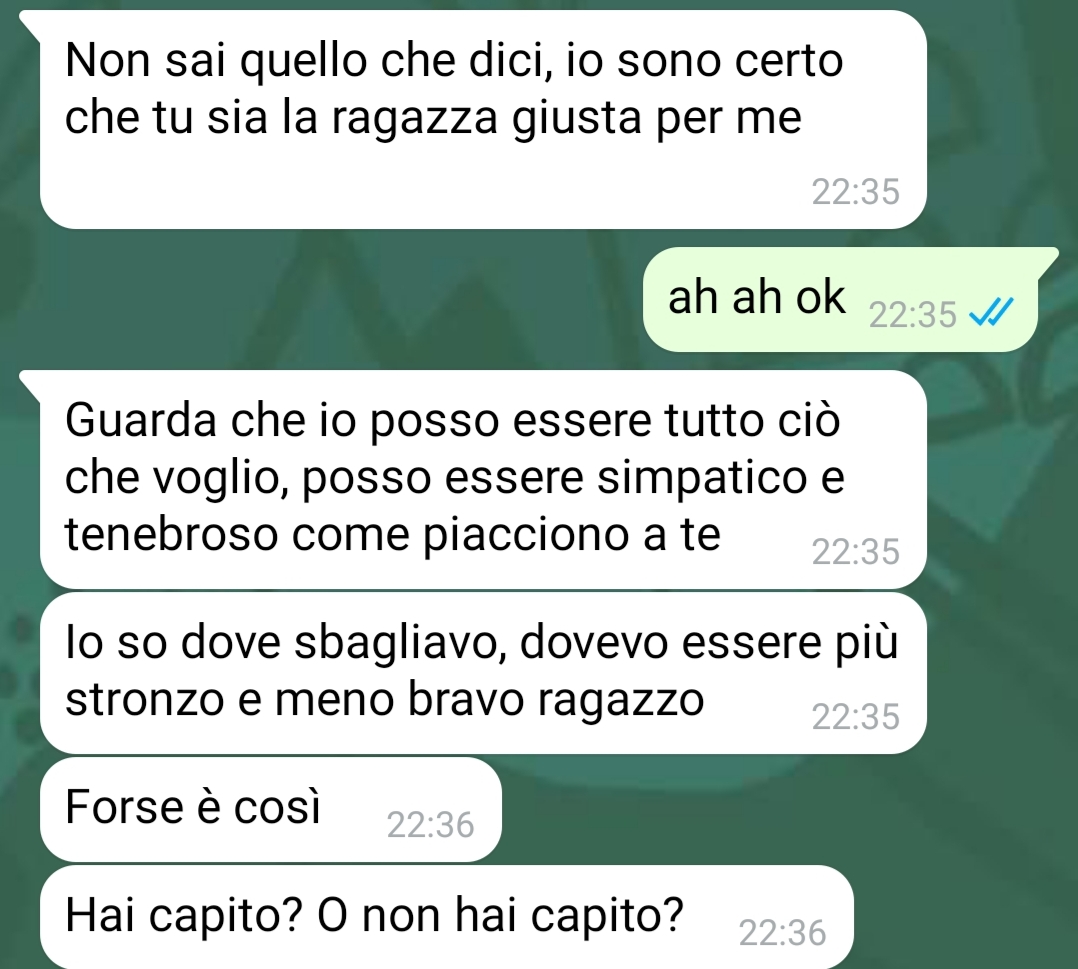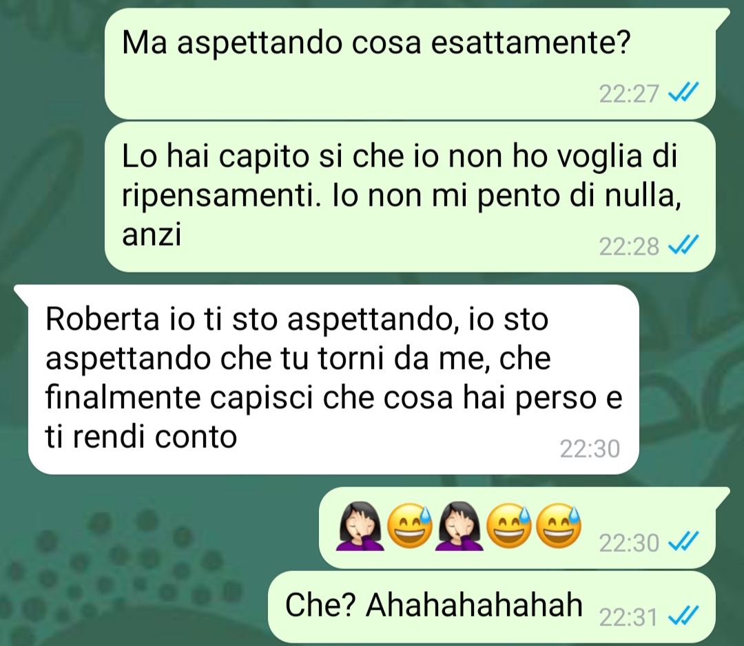 Nel racconto emerge un contrasto evidente tra la determinazione di Roberta nel voler chiudere definitivamente e la convinzione dell’ex di poter ribaltare la situazione con argomentazioni e discorsi persuasivi. La nostra fan appare ferma nella propria posizione, pur trovandosi a gestire una situazione che la lascia confusa e infastidita.