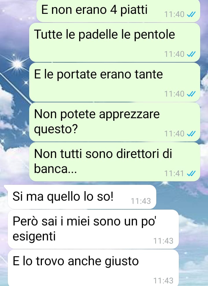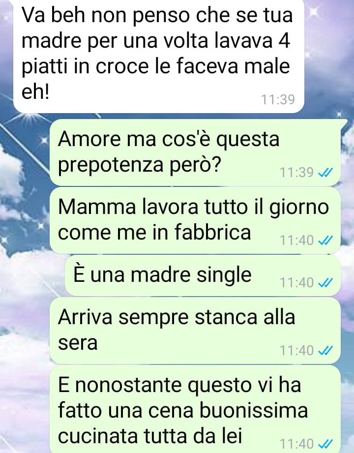 La mattina successiva, come gesto di cortesia, ha scritto al fidanzato per sapere se lui e i suoi genitori si fossero trovati bene. Si aspettava una risposta gentile o almeno un ringraziamento, ma invece — racconta — le sono arrivate solo critiche e lamentele.