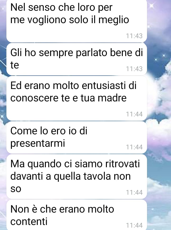 Durante la conversazione sull’argomento, il suo ragazzo le aveva detto che, nella sua famiglia, è tradizione che quando si conoscono i genitori della ragazza, si presentino nello stesso momento anche i propri. Una sorta di “incontro ufficiale” tra le due famiglie, come gesto di rispetto reciproco.