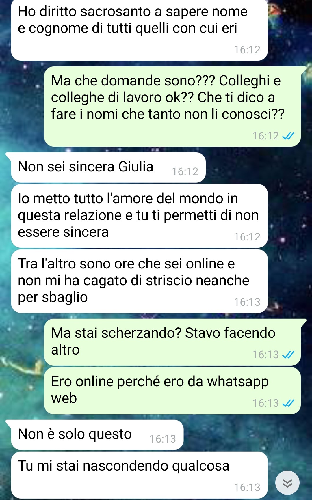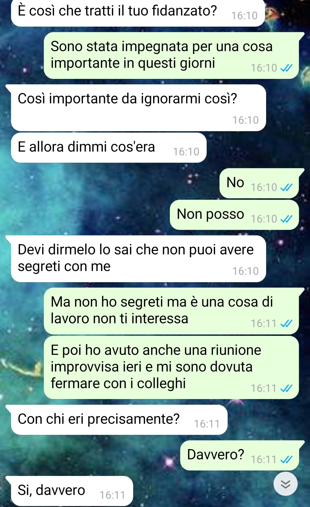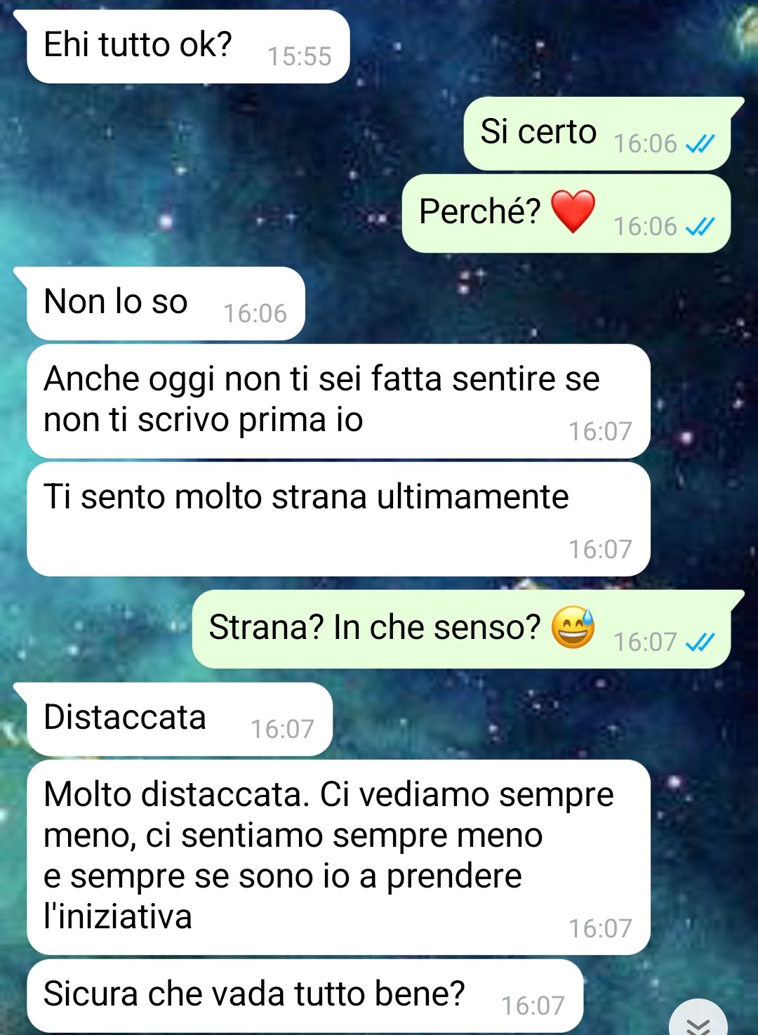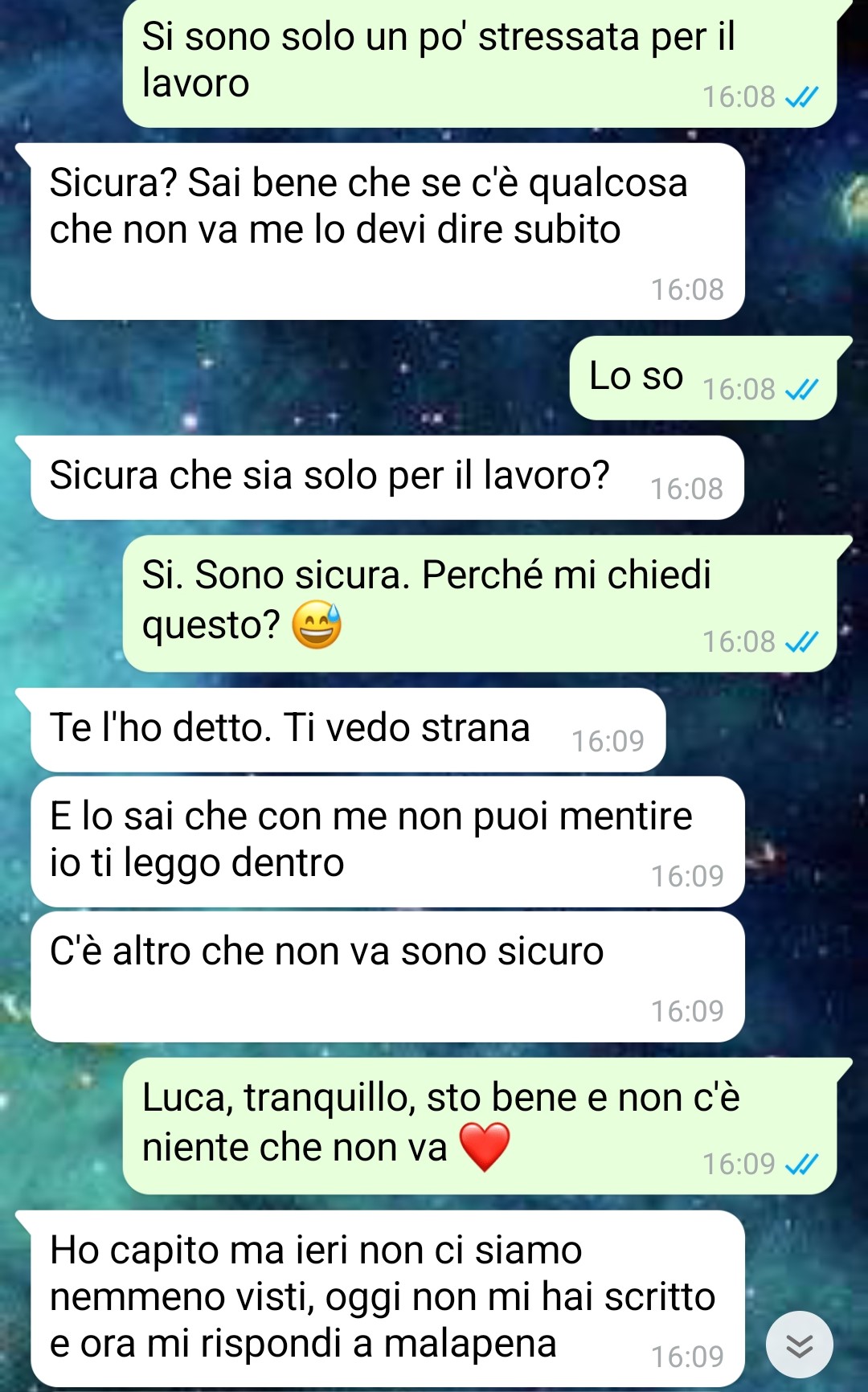 Da qualche settimana, Luca mi osservava con uno sguardo diverso, più sospettoso. Aveva iniziato a fare domande insistenti, chiedendomi dove vado, con chi sono e perché non gli rispondo subito ai messaggi. Io cercavo di tranquillizzarlo, ma più provavo a spiegare, più lui sembrava convinto che ci fosse qualcosa che non gli stavo dicendo. Le sue accuse erano sempre più pesanti. La tensione tra noi era diventata insostenibile. Luca credeva che gli stia nascondendo qualcosa, e, in un certo senso, aveva ragione. Mi sentivo in colpa per i suoi sospetti, ma non potevo rivelargli la verità. Ogni tentativo di rassicurarlo finiva solo per peggiorare la situazione, e vedevo il suo sguardo diventare sempre più scuro. Ogni volta che cercavo di parlargli, era come se costruissi un muro più alto tra noi. Ma non potevo cedere. La situazione non era delle migliori e quindi, dato che ero pienamente dalla parte della ragione, non potevo cedere e dirgli subito la verità. Quello che è certo è che niente accade per caso e determinate situazioni sono solamente il risultato di quanto coltivato in precedenza.