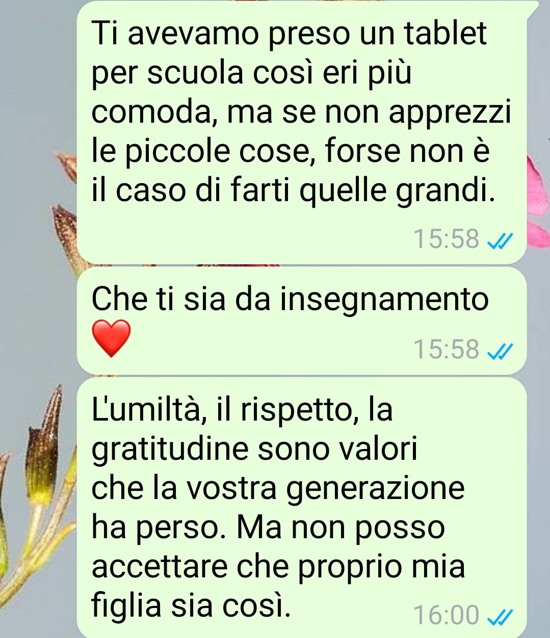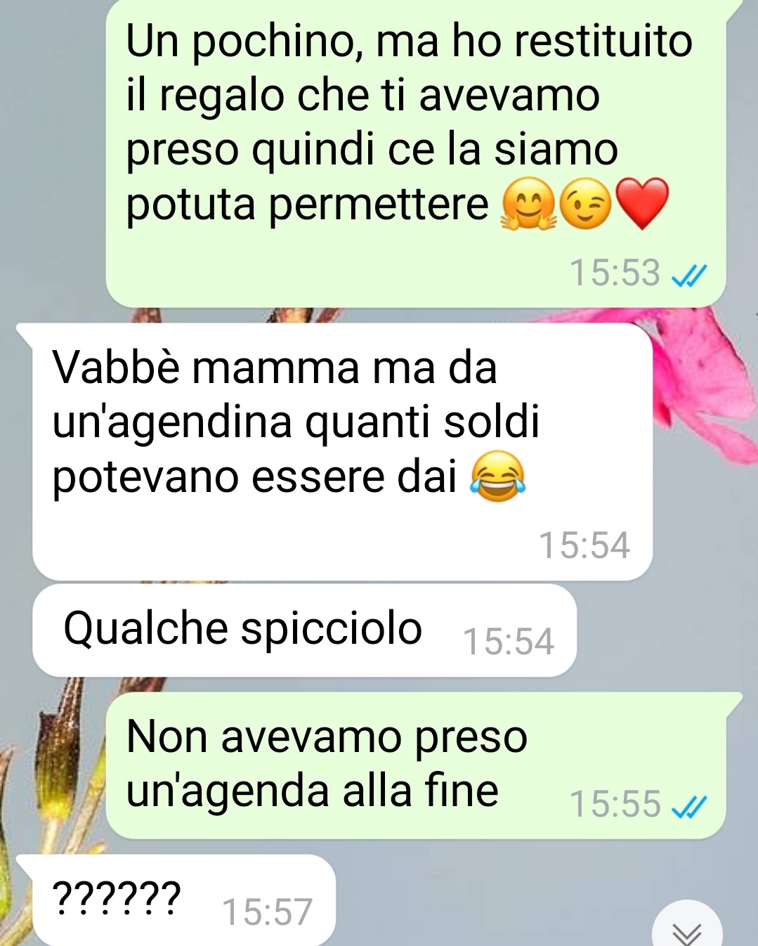 La nostra fan ha allegato una conversazione con la figlia, in cui si intuisce la delusione provata in seguito alla reazione della ragazza. Un messaggio che lei sperava potesse generare felicità, ha invece scatenato freddezza e malumore. Per questo ha deciso di inviare questi screen a Commenti Memorabili: in parte per sfogarsi, in parte per cercare conforto da chi vive o ha vissuto dinamiche simili in famiglia.