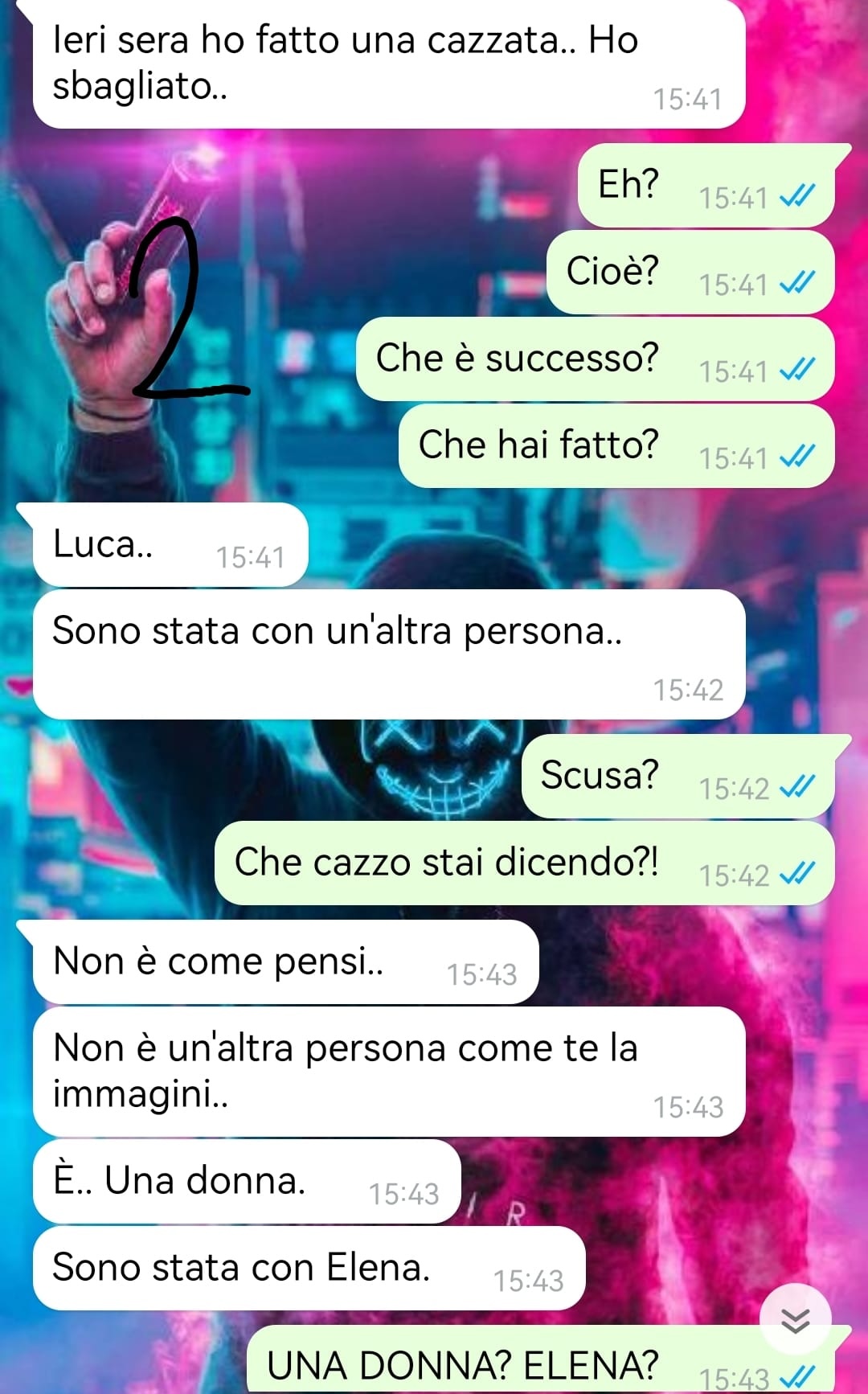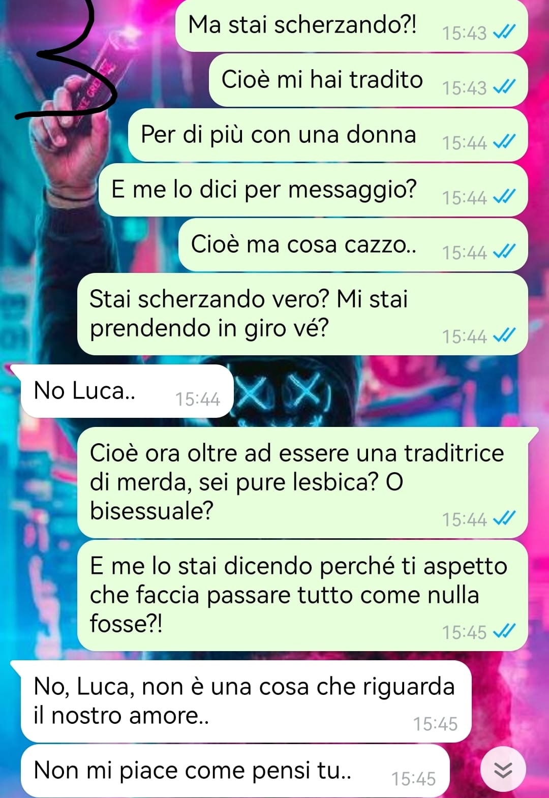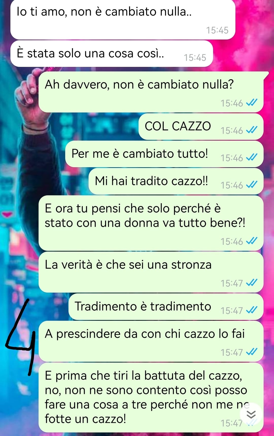 Non avrei mai pensato di trovarmi a scrivere queste parole, non avrei mai immaginato che sarebbe finita così, con me a cercare di mettere insieme i pezzi di un cuore distrutto e una mente confusa. Mi sento come se il mondo mi stesse crollando addosso. Ho sempre cercato di credere che l’amore, il nostro amore, fosse più forte di tutto. Eppure, dopo tutto quello che abbiamo passato insieme, mai avrei pensato che sarei stato tradito. Pensavo che, in un periodo difficile come questo, avremmo trovato il modo di affrontare tutto insieme, di risolvere i problemi e uscirne più forti. Ma no, invece lei hai scelto una strada diversa, quella che non mi sarei mai aspettato. E il peggio? Il peggio è che non solo mi ha tradito, ma lo ha fatto con una donna. Non riuscivo nemmeno a crederci quando me l’ha detto. Mi sembra tutto surreale. Ma è successo, e io devo affrontarlo. Non so se mi fa più male il tradimento in sé, la violazione della nostra intimità, o il fatto che mi abbia tradito in questo modo, con un’altra donna, come se non fosse già abbastanza doloroso. La confusione che sento dentro è indescrivibile, ma una cosa la so per certo: non c’è più fiducia, non c’è più nulla che ci possa tenere insieme. E la parte più difficile? È che ci credevo, e ora non posso più guardarla negli occhi.So che molti mi daranno dell’idiota, perché probabilmente una cosa simile è il sogno erotico di ogni uomo, ma no, sono un uomo, non un animale che va nel pallone all’idea della propria donna con un’altra. Il tradimento fa male sempre. Imparate ad affrontare i problemi, piuttosto che scappare in altre braccia, ci guadagnate voi, ed evitate di distruggere altre persone.
