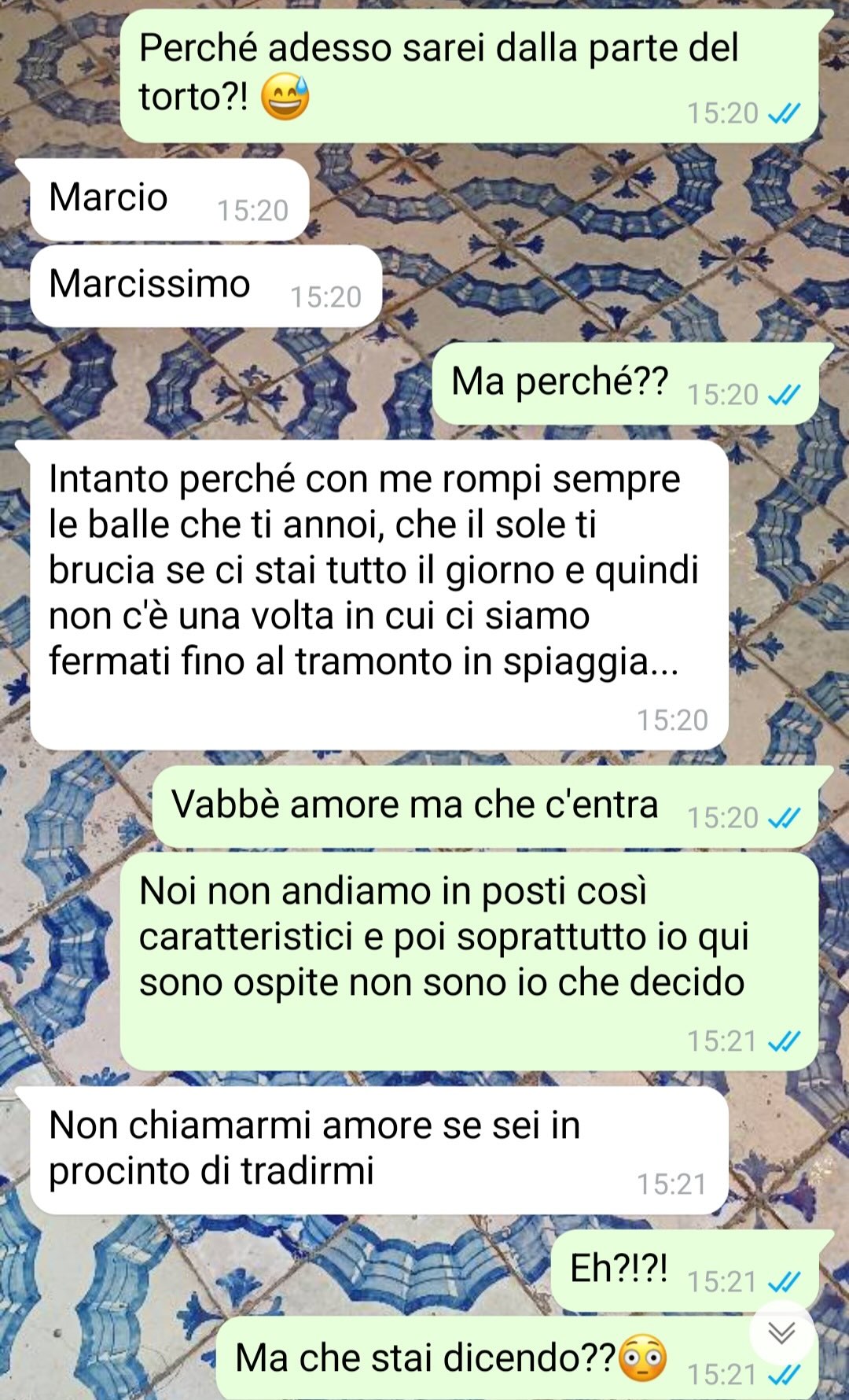 Non c’è niente di peggio di pensare di potersi fidare di una persona e poi ricevere accuse e pugnalate alle spalle come se non ci fosse un domani. Questo più o meno è quello che è successo a me con la mia fidanzata Marina, una ragazza dolce, semplice, ma spesso molto, troppo gelosa. La questione è semplice. Io ho una cara amica che abita in Sicilia e che vedo raramente (abbiamo studiato insieme al nord e ora è tornata giù). Gentilmente mi ha invitato a passare qualche giorno da lei e io ho accettato. Solo io, non la mia fidanzata, ma non ci vedo nulla di male considerando che non ha questa abbondanza di spazio e soprattutto lei non la conosce così bene, tutt’altro. Quindi sono partito, nonostante la non troppa convinzione di Marina e ho iniziato a vivermi una bellissima vacanza con la mia amica Alessandra. Bellissima fino a quando Marina non ha perso il controllo ed ha cominciato a lanciarmi delle accuse assurde. Non sapevo che fare, non capivo neanche il perché di quelle parole al veleno. Ma ero nel giusto al 2000% e quindi dovevo difendermi.