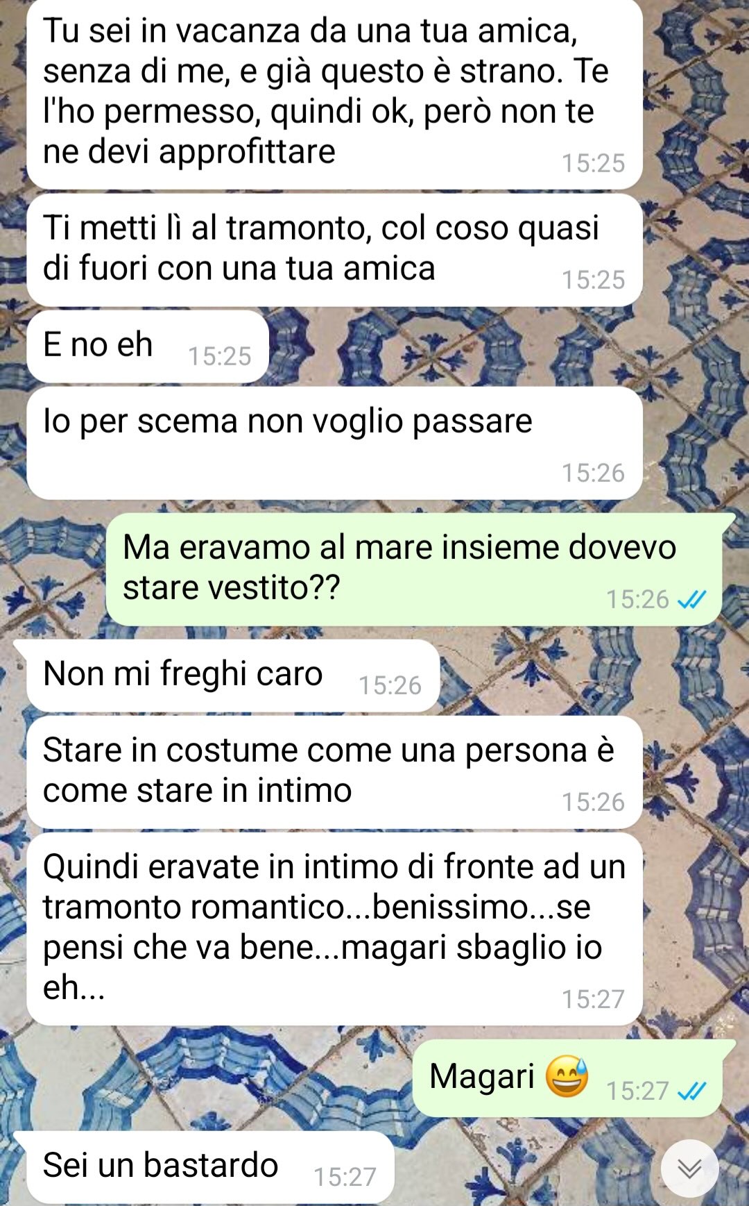Il nostro fan racconta una vicenda personale che ha messo seriamente in crisi la sua relazione con la fidanzata Marina. Descrive la ragazza come dolce e semplice, ma sottolinea un tratto del suo carattere che negli ultimi tempi ha creato diversi attriti tra loro: una gelosia eccessiva, spesso difficile da gestire.
