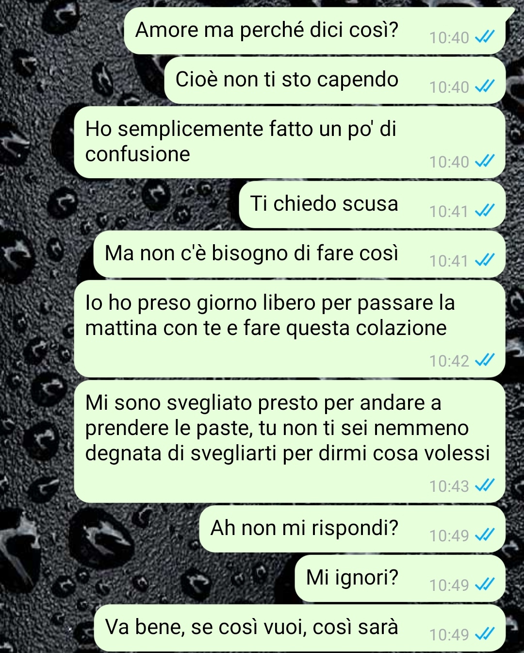 Questa situazione riflette la complessità delle relazioni di coppia, dove a volte anche le questioni più piccole possono trasformarsi in discussioni più grandi, spesso a causa di problemi sottostanti non risolti o di tensioni accumulate. Il lettore cerca una conferma sul fatto di aver agito correttamente resistendo piuttosto che accondiscendere durante il litigio.