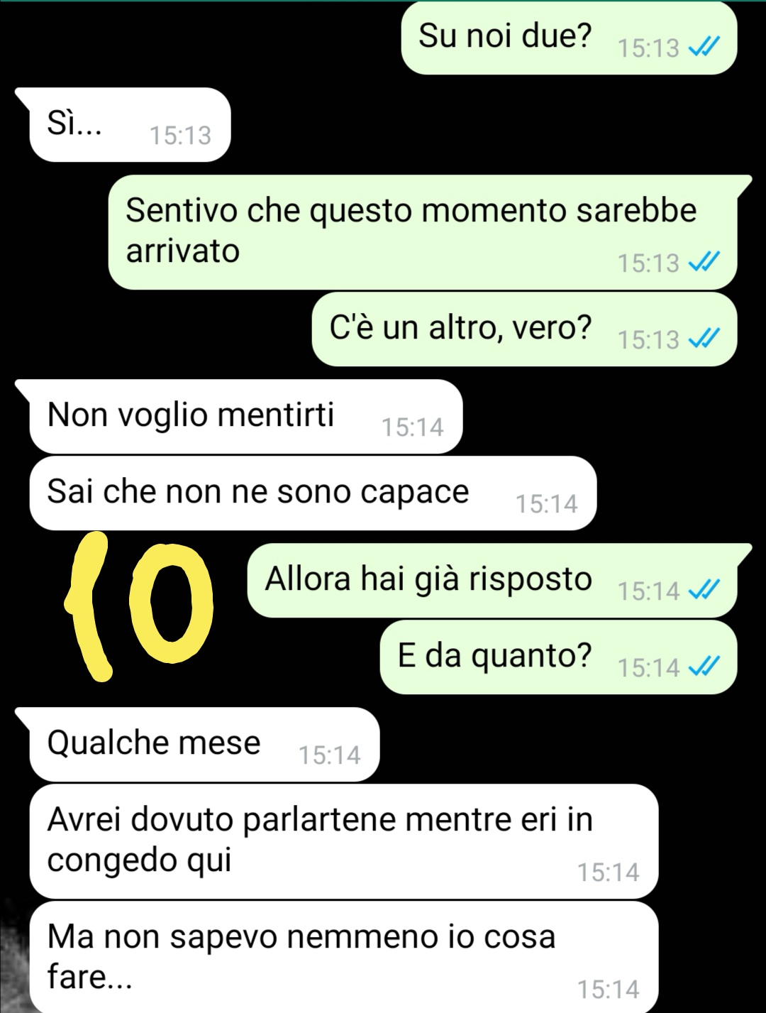 Nel mese di aprile ha avuto qualche giorno di permesso ed è rientrato brevemente a casa. Ma qualcosa, nel comportamento della moglie, gli è sembrato diverso. C’era una distanza emotiva che non riusciva a spiegarsi, una sensazione che ha continuato a tormentarlo anche al suo rientro in missione. Quando si è presentata l’occasione di avere un po’ di connessione e un momento libero, ha deciso di scriverle, provando a sondare il terreno e capire cosa stesse succedendo.