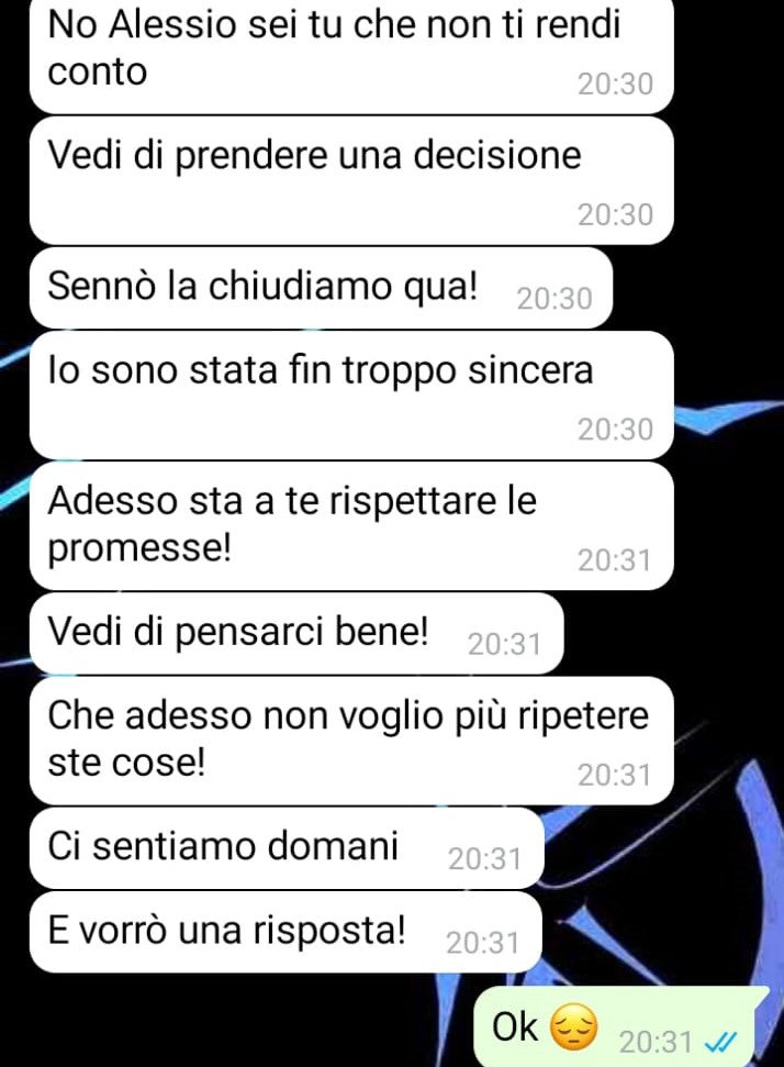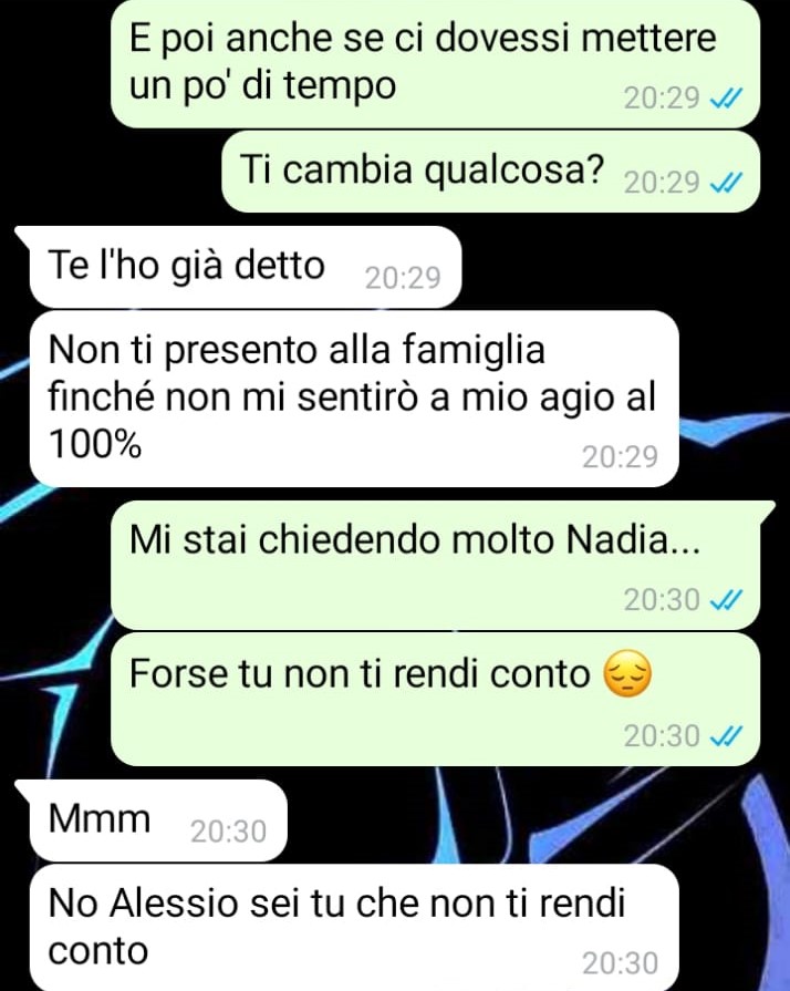Di fronte a questo scenario, Alessio si trova in una posizione complicata. Non vuole perdere Nadia e ritrovarsi di nuovo solo, ma allo stesso tempo non sa come gestire la situazione. La sua incertezza riguarda come affrontare le richieste di Nadia, mantenendo allo stesso tempo il benessere della sua persona.