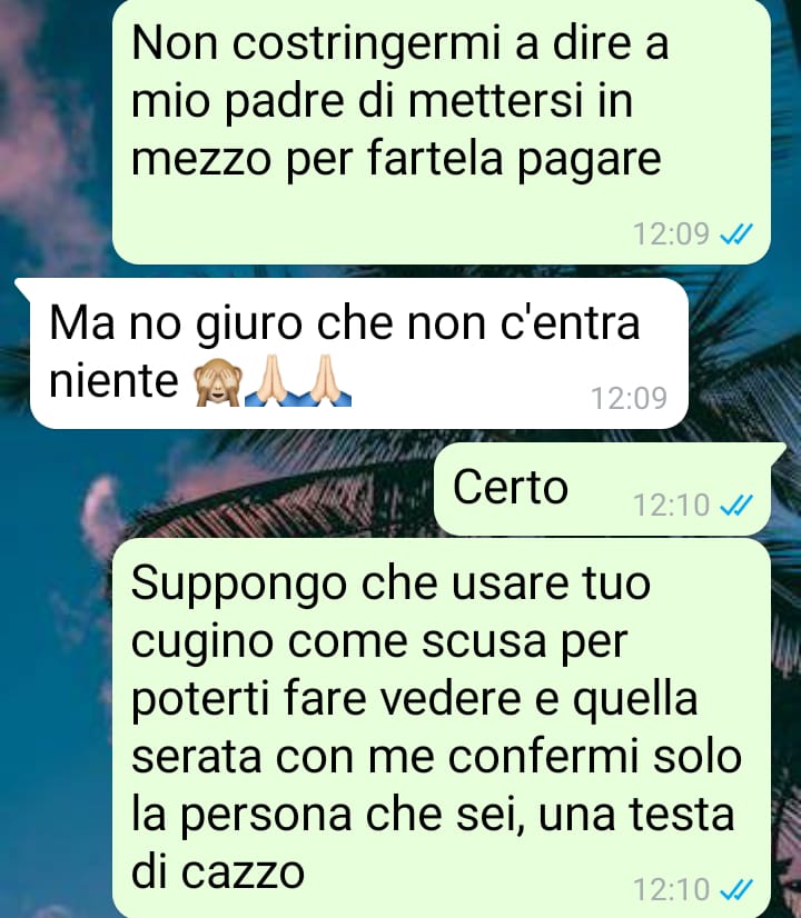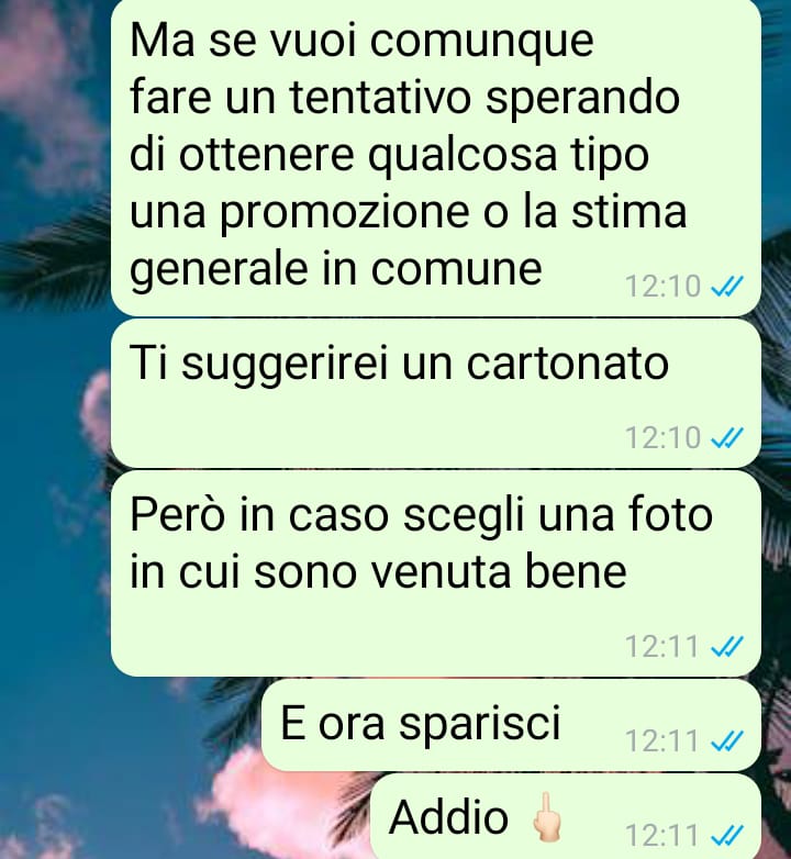 A quel punto ha deciso di scrivergli per chiedere spiegazioni. Da lì è nata una conversazione che ha deciso di condividere, perché ciò che ne è emerso le ha fatto capire quanto alcune persone possano arrivare a rendersi ridicole pur di ottenere qualcosa per interesse personale. A suo dire, l’ex ha mascherato un bisogno concreto dietro il pretesto di un chiarimento, cercando un ultimo favore che nascondeva ben altre intenzioni.