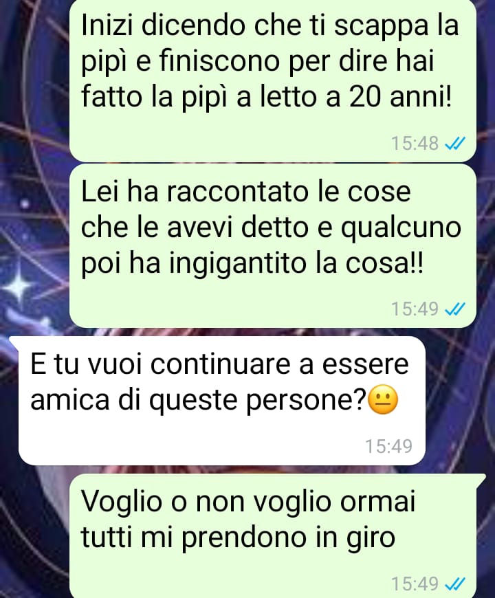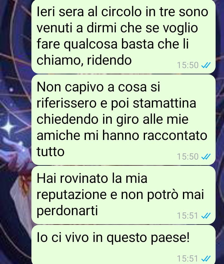 La settimana precedente a quanto accaduto, grazie a qualche giorno di ferie, la nostra amica era riuscita a fermarsi un giorno in più. Tuttavia, al suo rientro in paese, ha scoperto qualcosa di completamente inaspettato: una voce che la riguardava stava circolando rapidamente, diventando oggetto di pettegolezzi e commenti da parte di tutti.