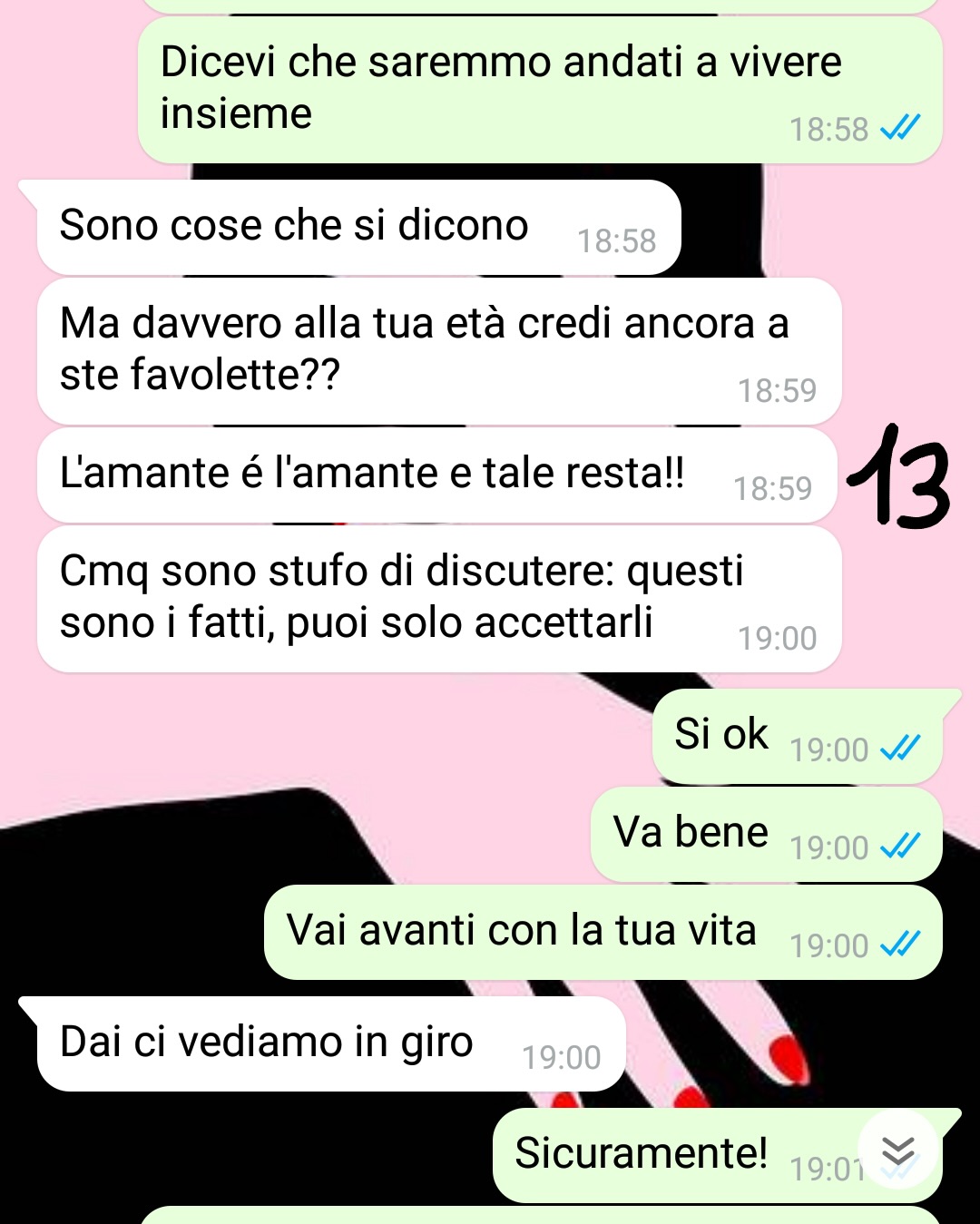 Ma proprio quando tutto sembrava pronto per iniziare davvero, lui ha mostrato un altro lato. Ha fatto qualcosa – o detto qualcosa – che la nostra amica non si aspettava. Ha scelto di condividere la conversazione avuta con lui per mostrare come, anche dopo anni di promesse e attese, la verità possa essere ben diversa da ciò che si desiderava.