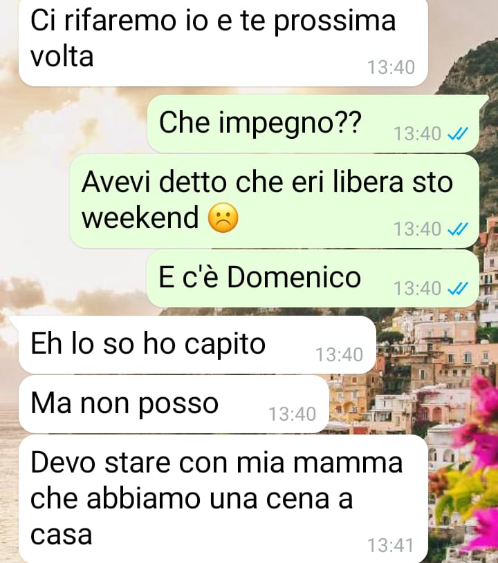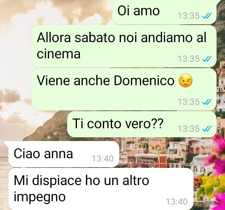 Mi chiamo Anna e la chat che vi mando è con quella che consideravo la mia migliore amica da quando ci siamo conosciute tra i banchi di scuola. Purtroppo c’era una realtà di lei (o meglio, della sua famiglia!) che non conoscevo e ora che ho scoperto tutto mi sento disgustata ad averla frequentata. Tutta la verità è saltata fuori quando parlavamo di mio cugino e del loro interesse reciproco che non potevano di certo nascondere a me. Quello che mi ha sconvolto sono state le sue parole, perché mi ha letteralmente detto che suo padre non le permetterebbe mai di frequentare mio cugino Domenico. Sono rimasta molto colpita da questi messaggi, perché abbiamo 24 anni e lei è sempre stata molto indipendente nelle scelte. Ho chiesto subito spiegazioni e alla fine sono riuscita a farle raccontare tutto. Inutile dire che la motivazione mi ha lasciato ancora più sconvolta, perché certi ragionamenti non si possono davvero più sentire!! Vorrei che leggeste tutto e che mi deste anche voi un parere su come avreste reagito, perché io penso di non poter essere più sua amica finché non si scuserà con entrambi!