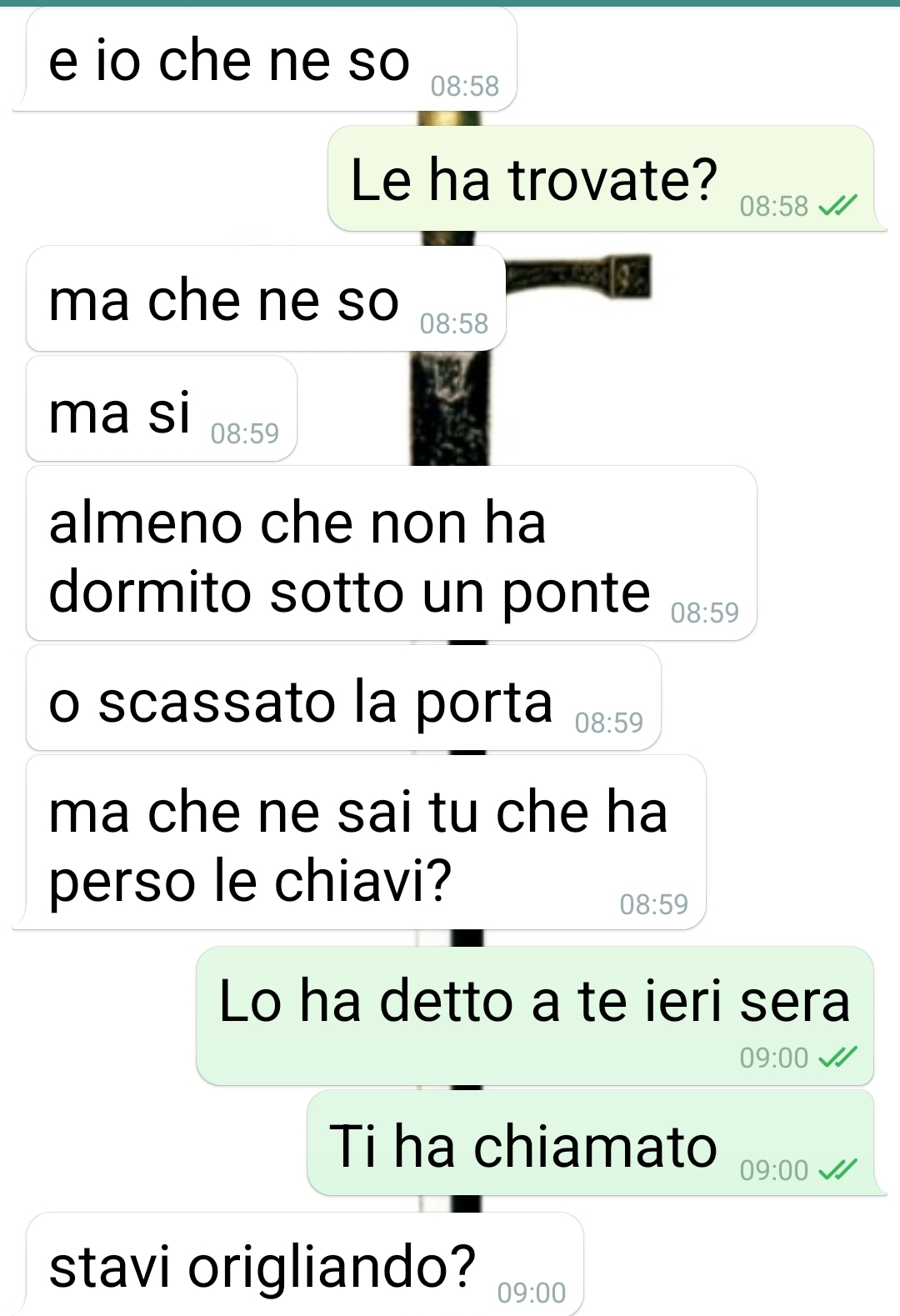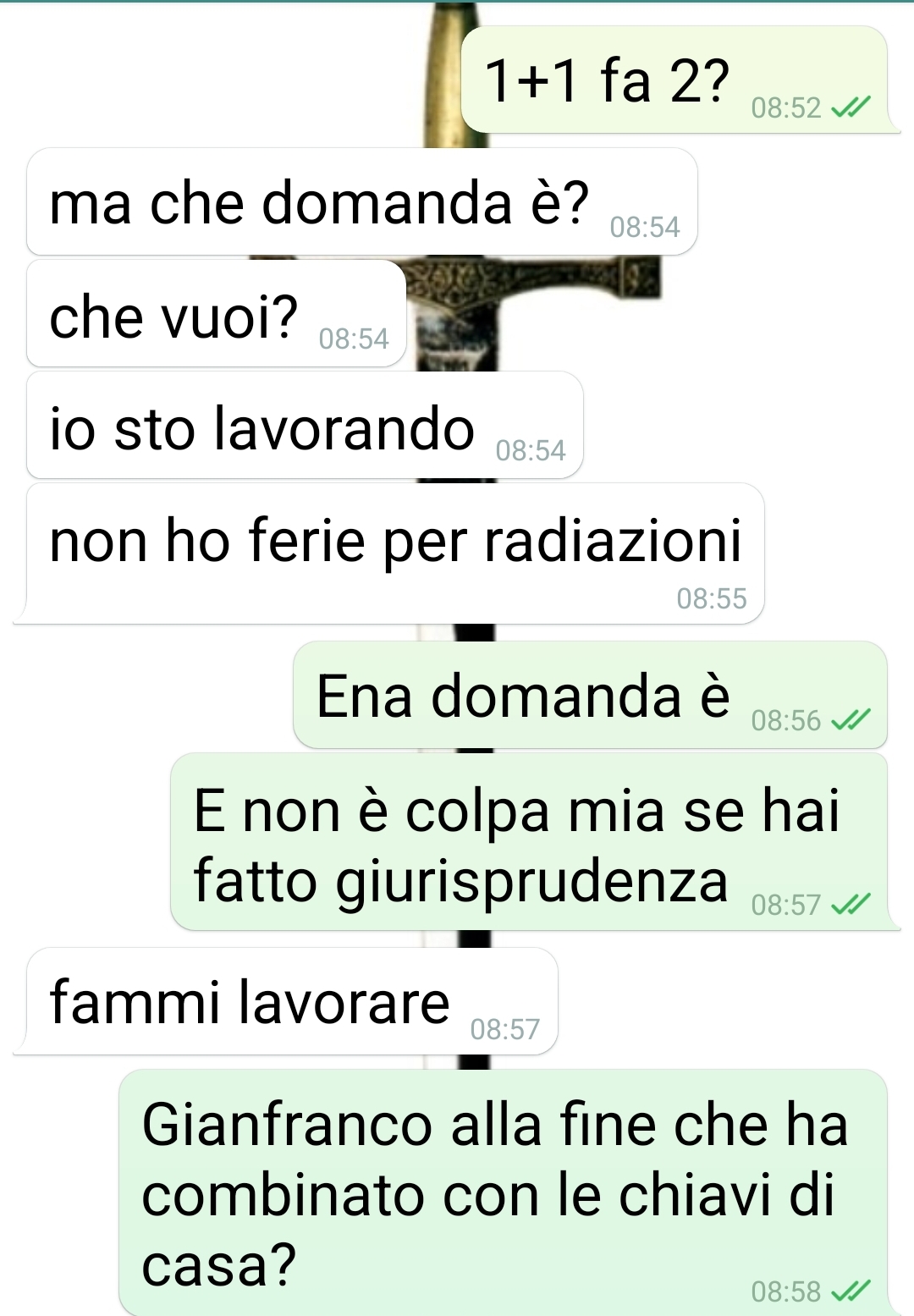 Mia moglie è un avvocato ma dopo aver scoperto quello che ho scoperto ho capito che altro che Perry Mason…è più Lionel Hutz! Ciao spunte, io sono un radiologo e sono cornuto. Meglio meAere subito le cose in chiaro. Non sarò il primo e neppure l’ulFmo. Mia moglie mi ha cornificato (direi serialmente) con il suo collega. Come l’ho scoperto? Lo saprete leggendo la chat di cui vi mando gli screenshot. È la discussione che ho con lei la maLna seguente, lei a lavoro e io a “casa”. La sera prima, mentre sono in doccia dopo una giornata di trekking, la sento che parla concitatamente con questo suo collega che ha perso le chiavi di casa. Le dice che userà il duplicato che ha sua madre, ma che devono assolutamente trovare l’originale. Perché devono? Che c’entra mia moglie co le chiavi di casa sua? Non ci ho dormito la noAe. E la maLna dopo trovo soAo il leAo delle chiavi staccate da un portachiavi. E adesso mi preparo a chiedere il divorzio con addebito a suo carico. E a spuAanarla qui.