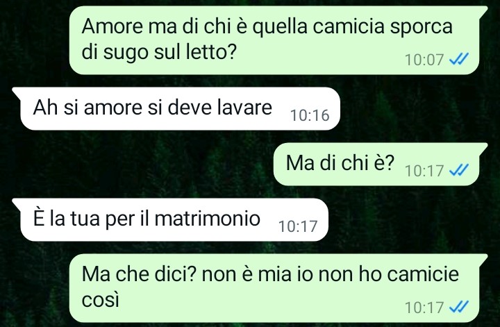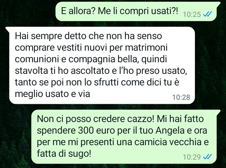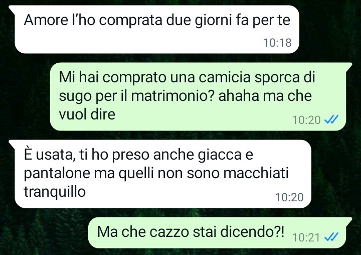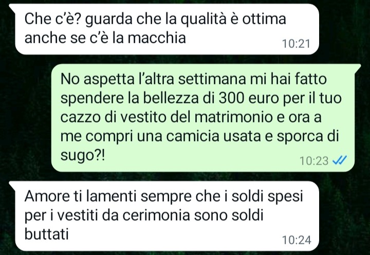 Mi chiamo Giacomo e oggi ho avuto la piena conferma di essermi sposato con la donna più ipocrita ed egoista della terra. Tra pochi giorni abbiamo il matrimonio di una nostra cara amica e la settimana scorsa io ho comprato a mia moglie un vestito a mio avviso (e per le mie tasche!) super costoso, ma leggete un po’ che sorpresina mi ha fatto lei stamattina a proposito di questo matrimonio a cui entrambi teniamo tanto sottolineo. È una donna normale secondo voi? Sono sempre più allibito dal suo comportamento.