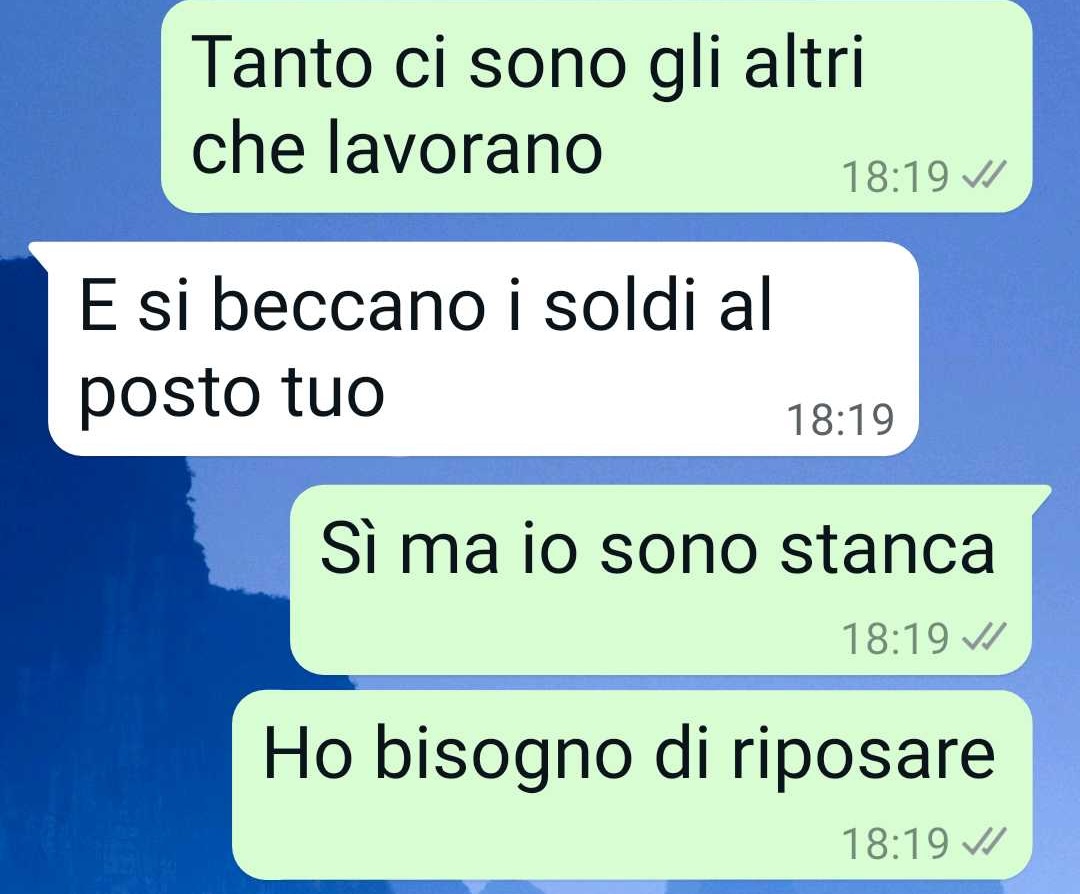 Mi chiamo Carmen e prenderò due settimane di vacanza perdendo dei soldi. Per il mio compagno è da irresponsabili. In banca ho la bellezza di tipo 1500 euro. Ho mutuo sulle spalle, bollette, spesa e tutto quello che serve. Non ho la macchina per fortuna perché lavoro da casa. Ho un buon giro di clienti quindi insomma sono più o meno tranquilla. Ma quello che mi chiede il mio compagno è assurdo. In pratica io non dovrei andare in vacanza questa estate secondo lui. Dovete sapere che sono cotta. Non ce la faccio più. Muoio letteralmente di caldo e ho il cervello che definirlo fuso è poco. Per lui non è importante la mia salute ma che procacci altri soldi per il bambino. Un bambino a cui voglio bene certo… Non mi sentirò in colpa per lui però… Non posso sacrificare le mie vacanze, il mio benessere per il bambino. E che sono io?? Non prendetemi per cattiva e per stronza. La storia va letta prima di guidicare. Mando la chat per tutte le donne che si rompono il cul** tutto l’anno, per quelle che mandano avanti la baracca, mentre una sigaretta fuma dalle loro labbra con gli occhi stretti in un bianco e nero contemporaneo.