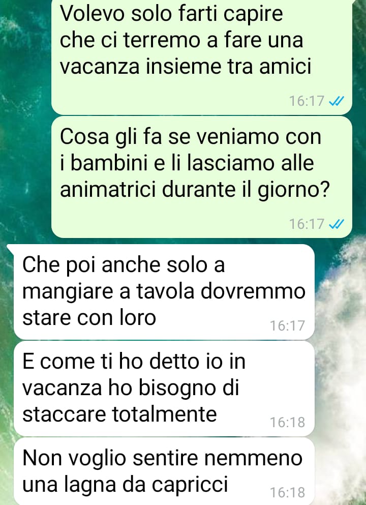 Il nostro amico – così definisce il marito nel racconto – da tempo propone al suo migliore amico e alla compagna di organizzare una vacanza insieme. Tuttavia, fino a ora non era mai stato possibile, soprattutto per via della presenza dei bambini e delle difficoltà logistiche. Proprio per questo motivo, la nostra follower ha deciso di scrivere direttamente alla compagna dell’amico, con l’intenzione di spiegare quanto possa essere semplice gestire una vacanza scegliendo una struttura adeguata.