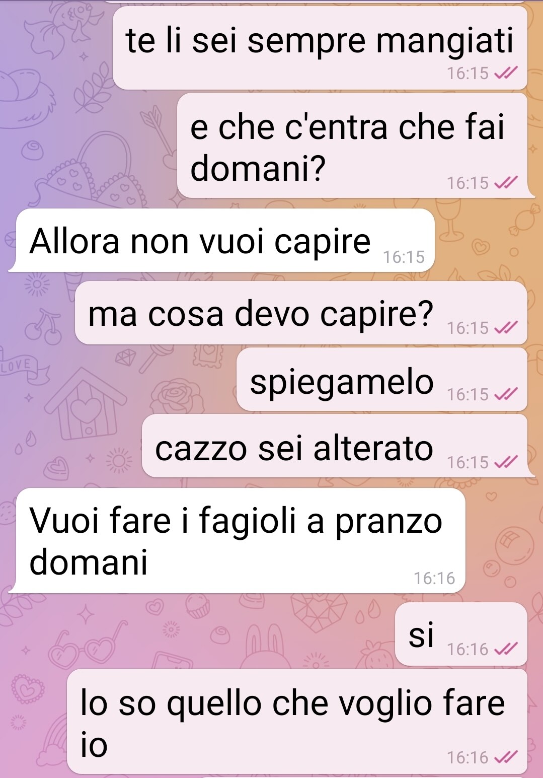 La nostra fan Letizia ha deciso di condividere con Commenti Memorabili una conversazione avvenuta con il suo compagno Marco, definita da lei stessa “tragicomica”. Un episodio che l’ha fatta ridere e arrabbiare allo stesso tempo, tanto da spingerla a volerlo rendere pubblico per sbeffeggiare quello che definisce senza mezzi termini un uomo di 38 anni che, a suo dire, non è in grado nemmeno di aprire una scatoletta di tonno senza aiuto.