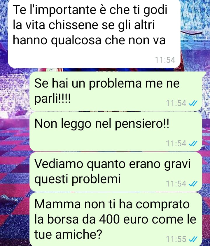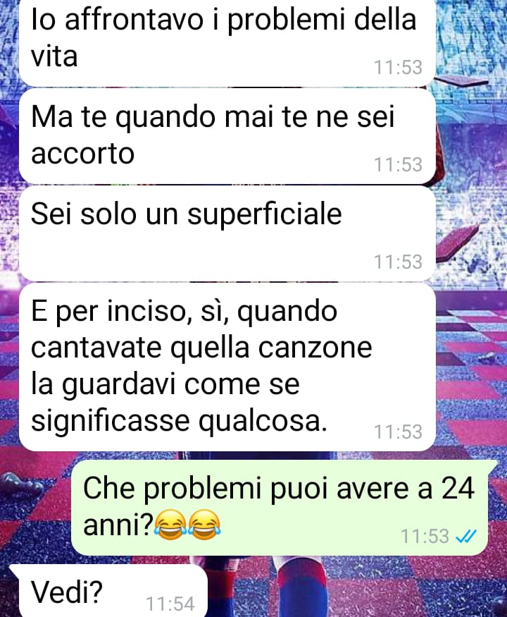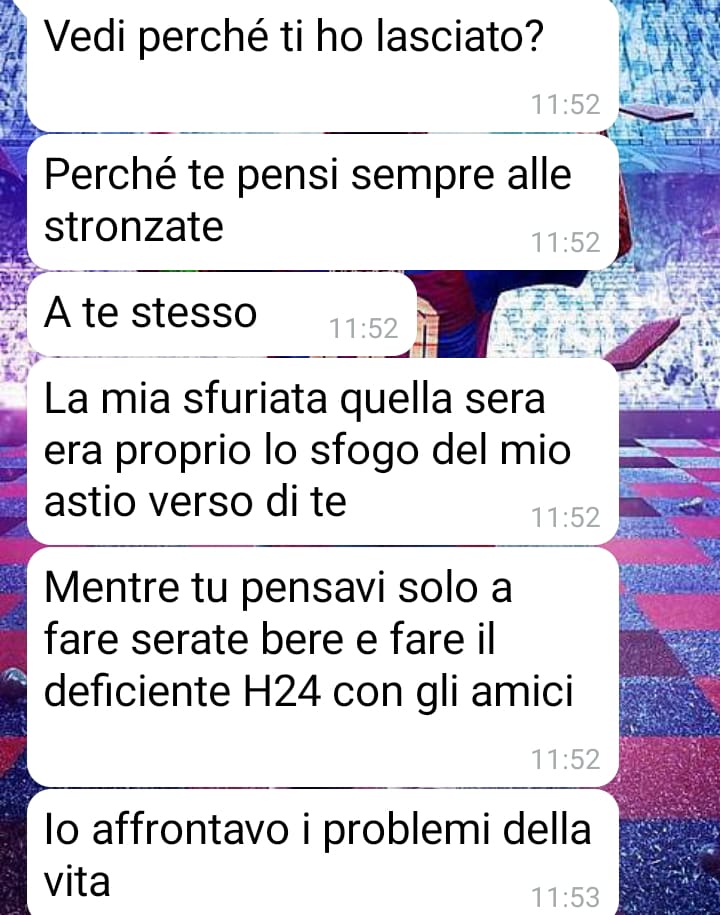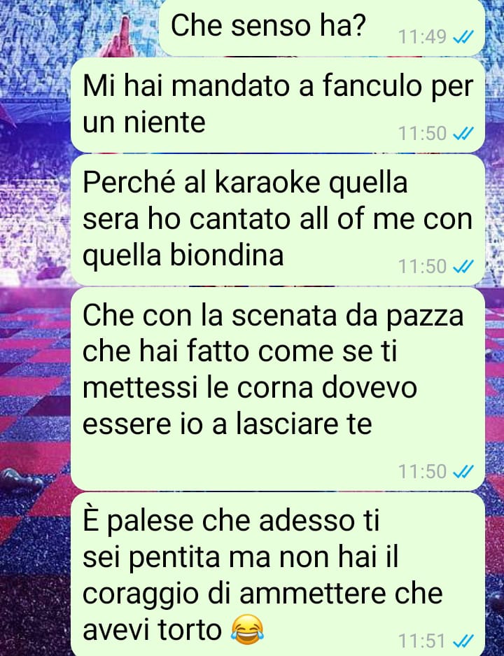 Il nostro fan ha raccontato di aver recentemente preso la decisione – definita da lui stesso “malsana” – di scrivere alla sua ex fidanzata, dopo circa un mese e mezzo dalla fine della loro relazione. L’intenzione era quella di riaprire un canale di comunicazione e, in qualche modo, provare a ricostruire un legame. Prima di raccontare l’esito della conversazione, il nostro follower ha voluto chiarire un punto per lui fondamentale: a suo dire, ha sempre trattato la ex con rispetto e correttezza, e ritiene che la fine della relazione sia avvenuta per motivi che definisce futili.