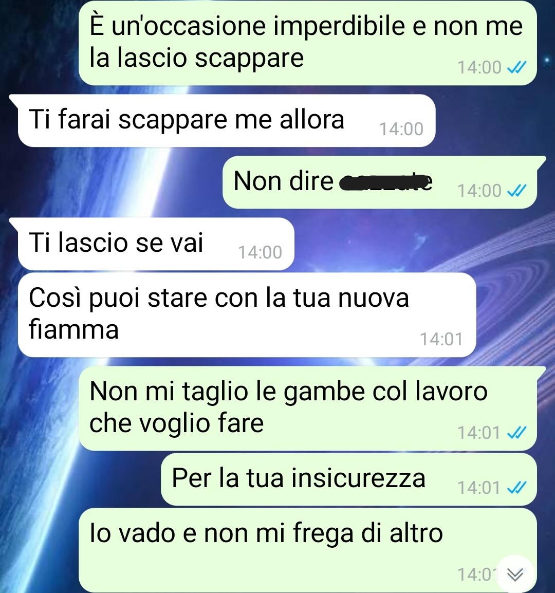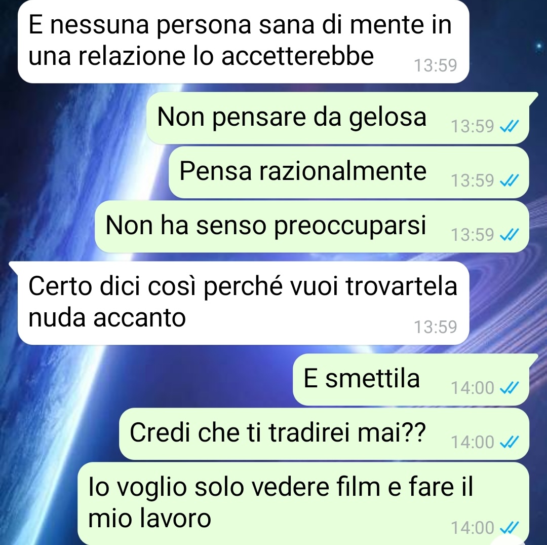 Secondo quanto racconta, molti potrebbero comprendere la reazione di Anna, ma osservando la situazione con lucidità il malcontento appare infondato. Il collega in questione non ha alcun ruolo ambiguo nella vita di Giuseppe, né rappresenta un pericolo per la loro relazione: è semplicemente il compagno di viaggio scelto per motivi professionali.